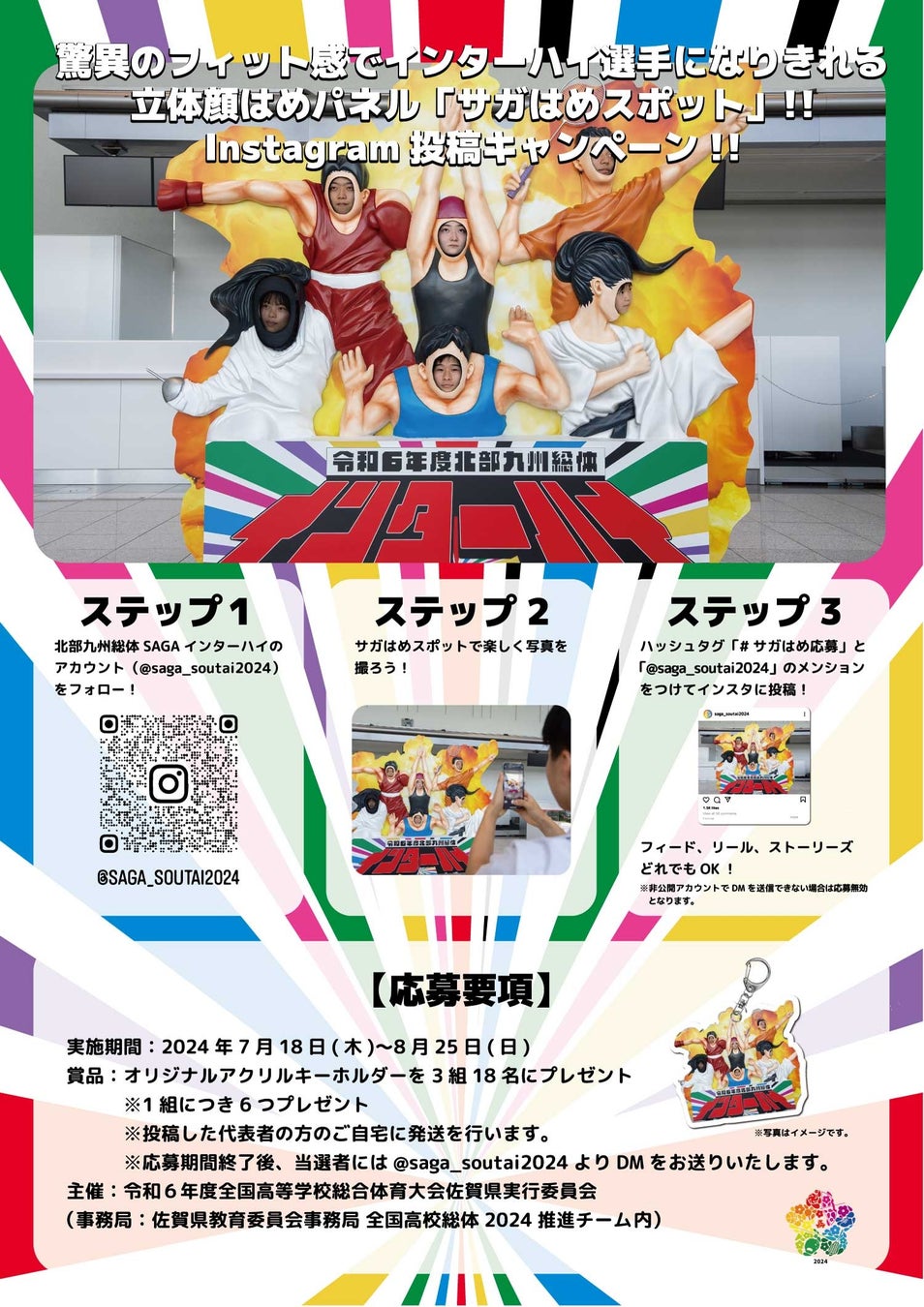 「令和6年度全国高等学校総合体育大会佐賀県実行委員会(事務局:佐賀県教育委員会事務局 全国高校総体2024推進チーム内)」と体験クリエイティブカンパニー「Afro&Co.」が、「令和6年度全国高等学校総合体育大会(北部九州総体)」の開催を記念して、7月18日(木)より九州佐賀国際空港内に「サガはめスポット」を設置開始しました。