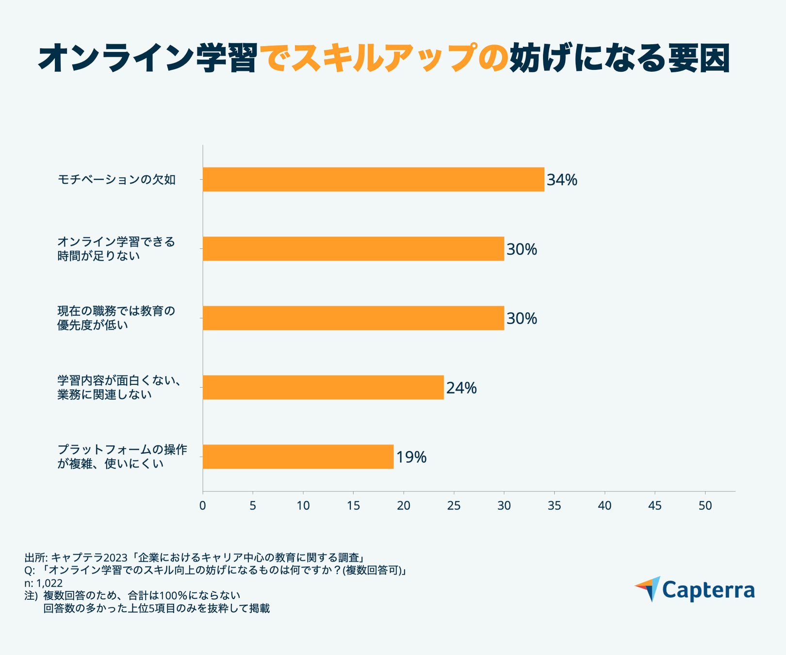 Q.「オンライン学習でのスキル向上の妨げになるものは何ですか?」(複数回答可)