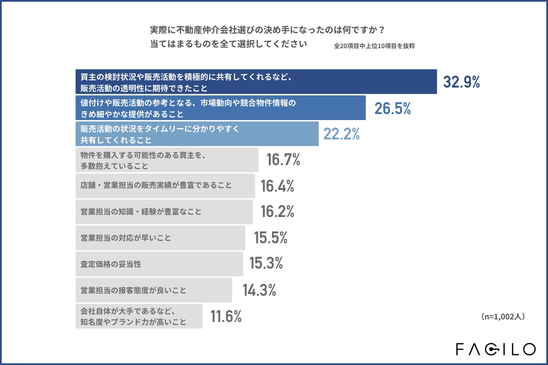 仲介会社選定の決め手は「買主の検討状況や販売活動の積極的な情報共有」「市場動向や競合物件の細やかな情報提供」「販売活動状況のタイムリーかつ分かりやすい共有」が上位となり、タイムリーな情報提供が売主の信頼獲得につながることが明らかになりました。