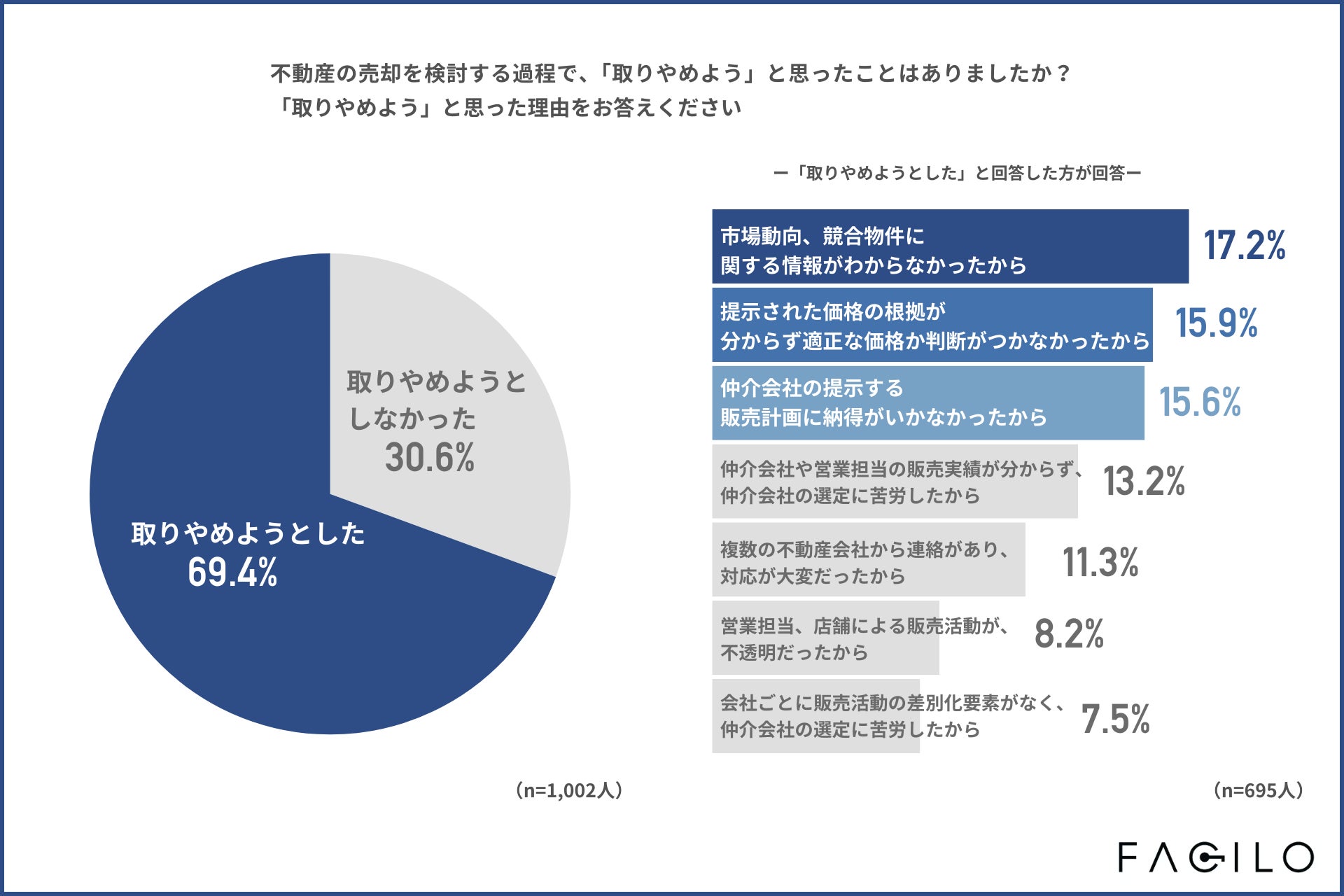 不動産売却の検討中に「取りやめようと思った」人は約7割。理由は「市場動向や競合物件に関する情報がわからなかったから」が最多で、情報不足への不安がうかがえます。