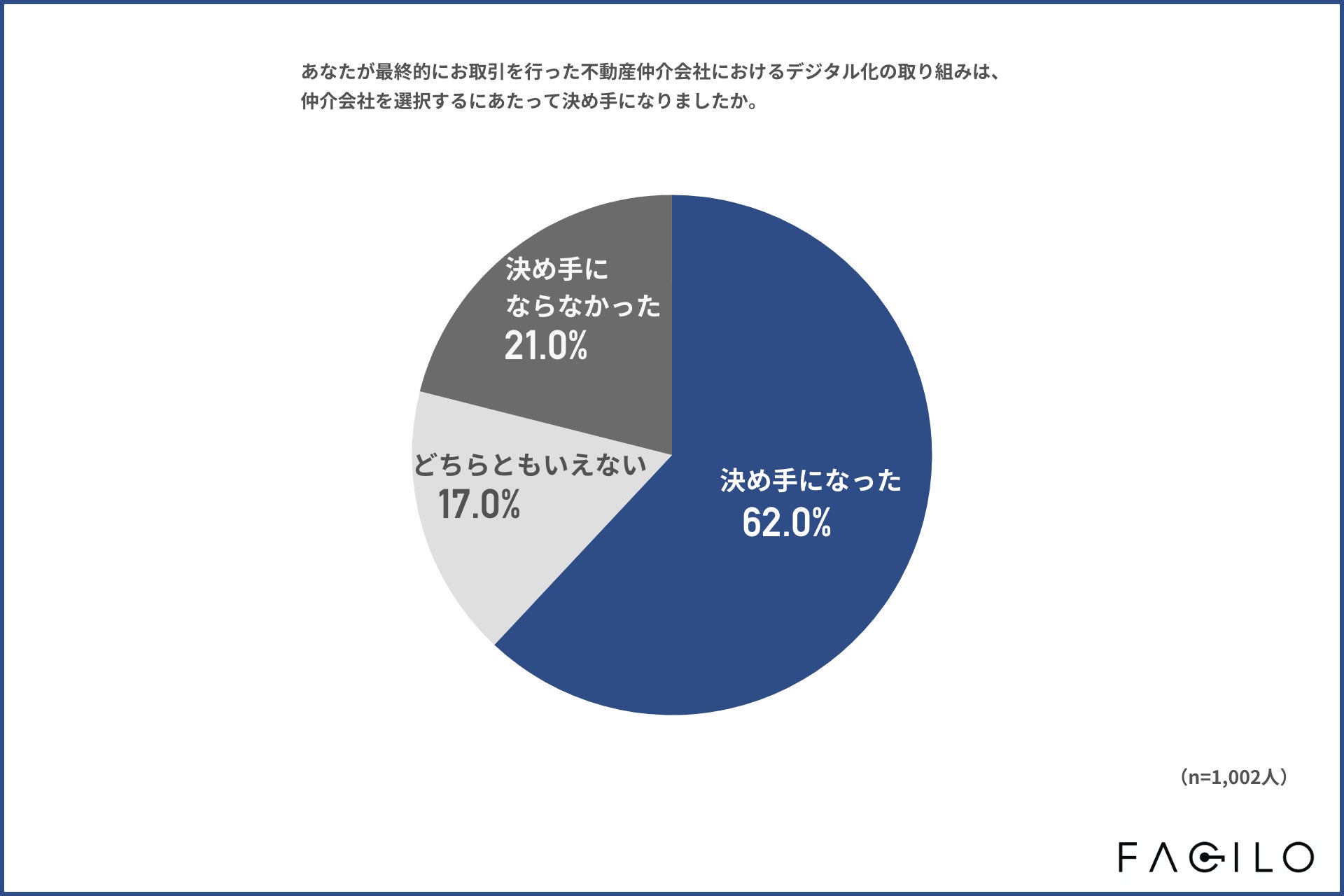 仲介会社を比較検討する際に「デジタル化が決め手になった」人は約6割と、仲介会社におけるDXへの評価の高さがうかがえます。