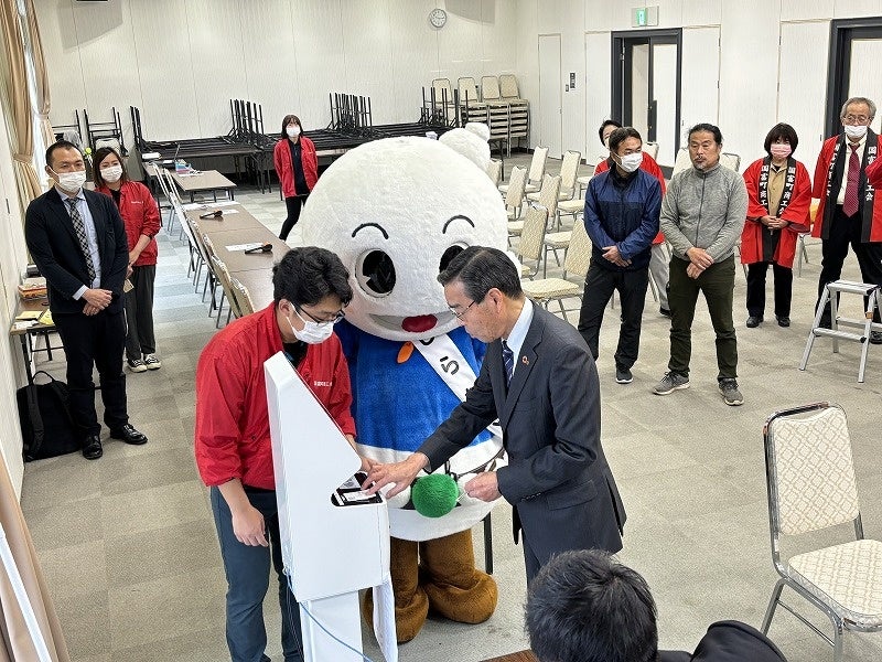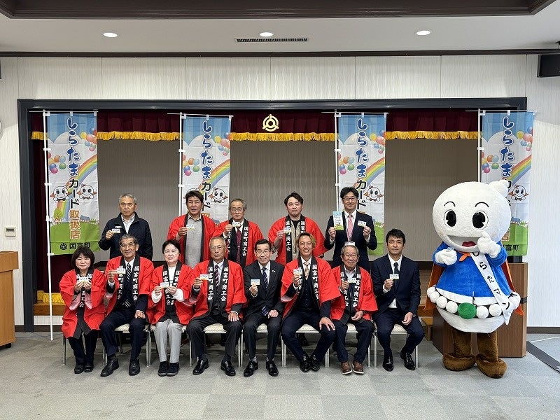 当日は、中別府尚文町長と町キャラクターのしらたマンが電子マネーをチャージし、今後の地域内経済循環に向けた大きな一歩を踏み出しました。