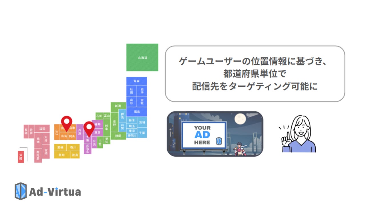 アドバーチャ株式会社(所在地:東京都北区、代表取締役社長:水野 征太朗、以下「アドバーチャ」)は、メタバース広告プラットフォーム「アドバーチャ」において、新たに都道府県単位での地域別広告配信機能を追加実装したことをお知らせいたします。