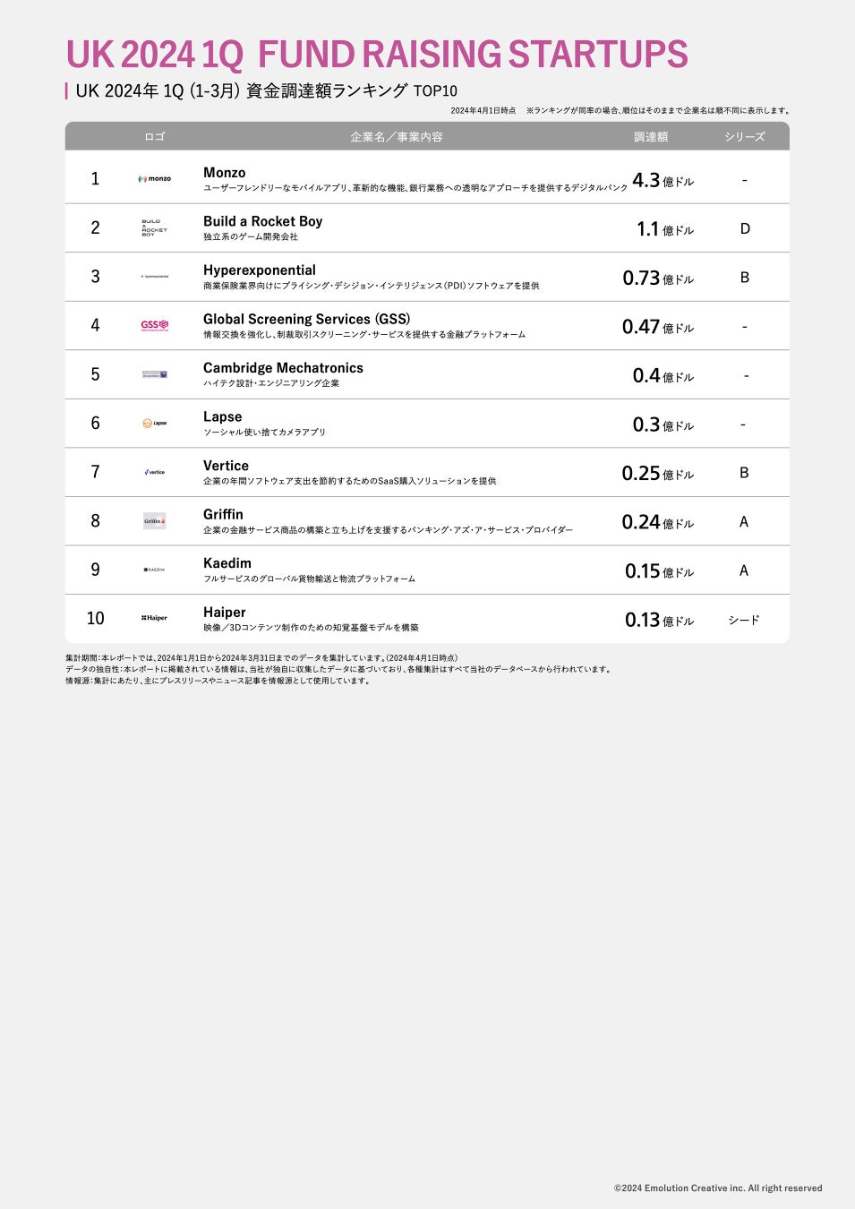 タイトル:UKスタートアップ資金調達額ランキングTOP10(2024年 1Q)