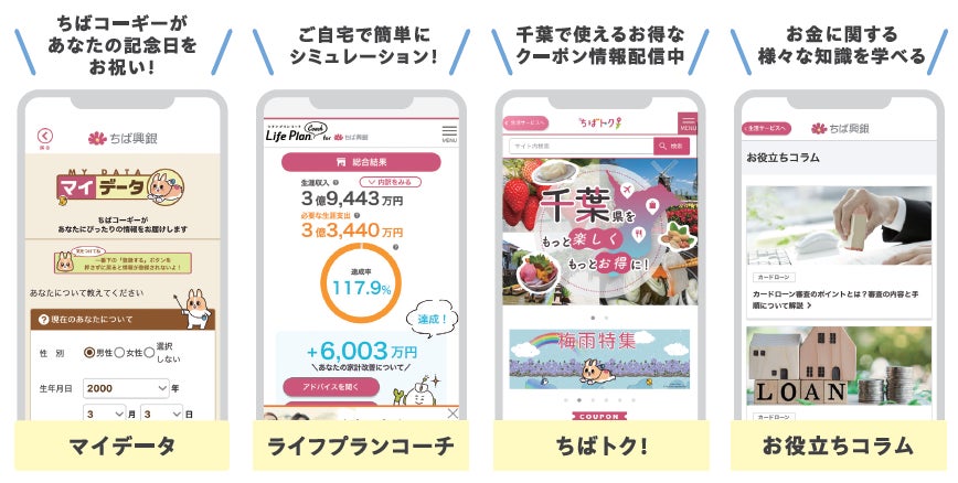 ライフプランのシミュレーションを通じた生活設計のサポートをはじめ、当行が運営する地域情報サイト「ちばトク!」に掲載している地域企業、クーポン、イベントなどの情報、お金や暮らしに関するお役立ち情報をお届けします。「生活サービス」では閲覧状況や「マイデータ」へ追加の情報をご入力いただくことで、お客さまに合わせた情報を発信してまいります。