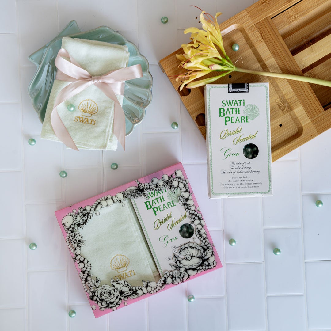 定番のSサイズ・Mサイズ以外にも、SWATiシェルハンドタオルとSWATi BATH PEARL®グリーンを華やかなケースにセットした特別なギフトコレクションも!