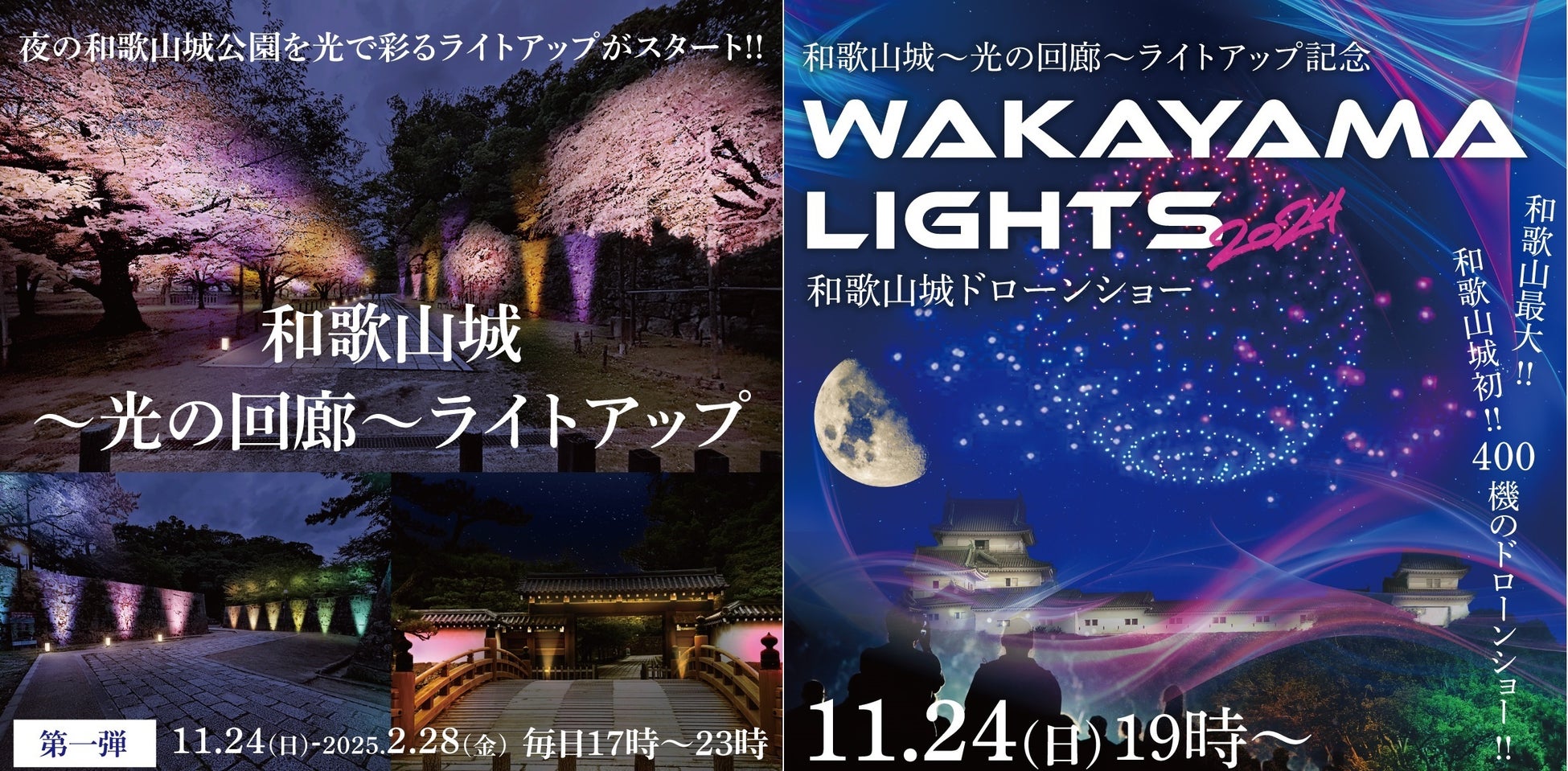 「和歌山城~光の回廊~」のライトアップを記念し、株式会社タカショーデジテック様及び株式会社ドローンショー・ジャパン様のご協力により、和歌山城“初”・和歌山“最大”となるドローンショー「WAKAYAMA LIGHTS 2024 presented by FeStA LuCe」を特別開催します!