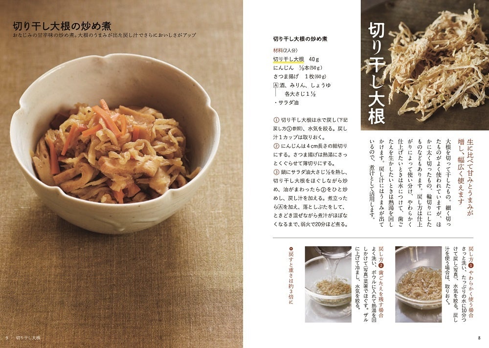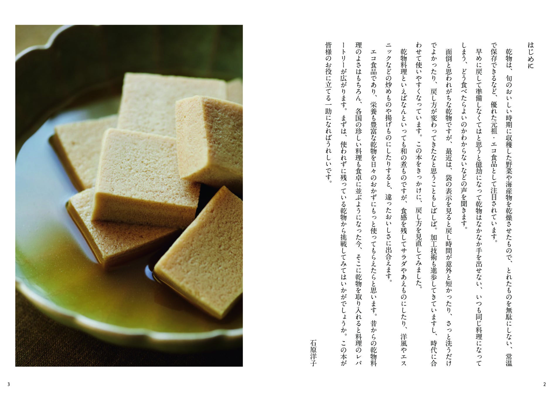 エコ食品であり、栄養も豊富な乾物を日々のおかずにもっと使ってもらえたらと思います。昔からの乾物料理のよさはもちろん、各国の珍しい料理も食卓に並ぶようになった今、そこに乾物を取り入れると料理のレパートリーが広がります。まずは、使われずに残っている乾物から挑戦してみてはいかがでしょうか。この本が皆様のお役に立てる一助になればうれしいです。