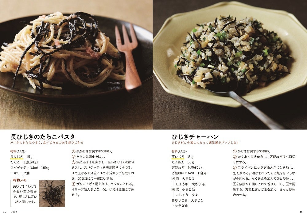 ひじきはホンダワラ科の海藻で、煮て、蒸らしてから乾燥させたもの。ひじきには枝分かれした芽の部分の”芽ひじき”と、長い茎の部分”長ひじき”がありますが、この本ではやわらかい芽ひじきを主に使っています。不足しがちな食物繊維やミネラルが豊富に含まれ、煮もの以外にもサラダなど幅広く使えます。