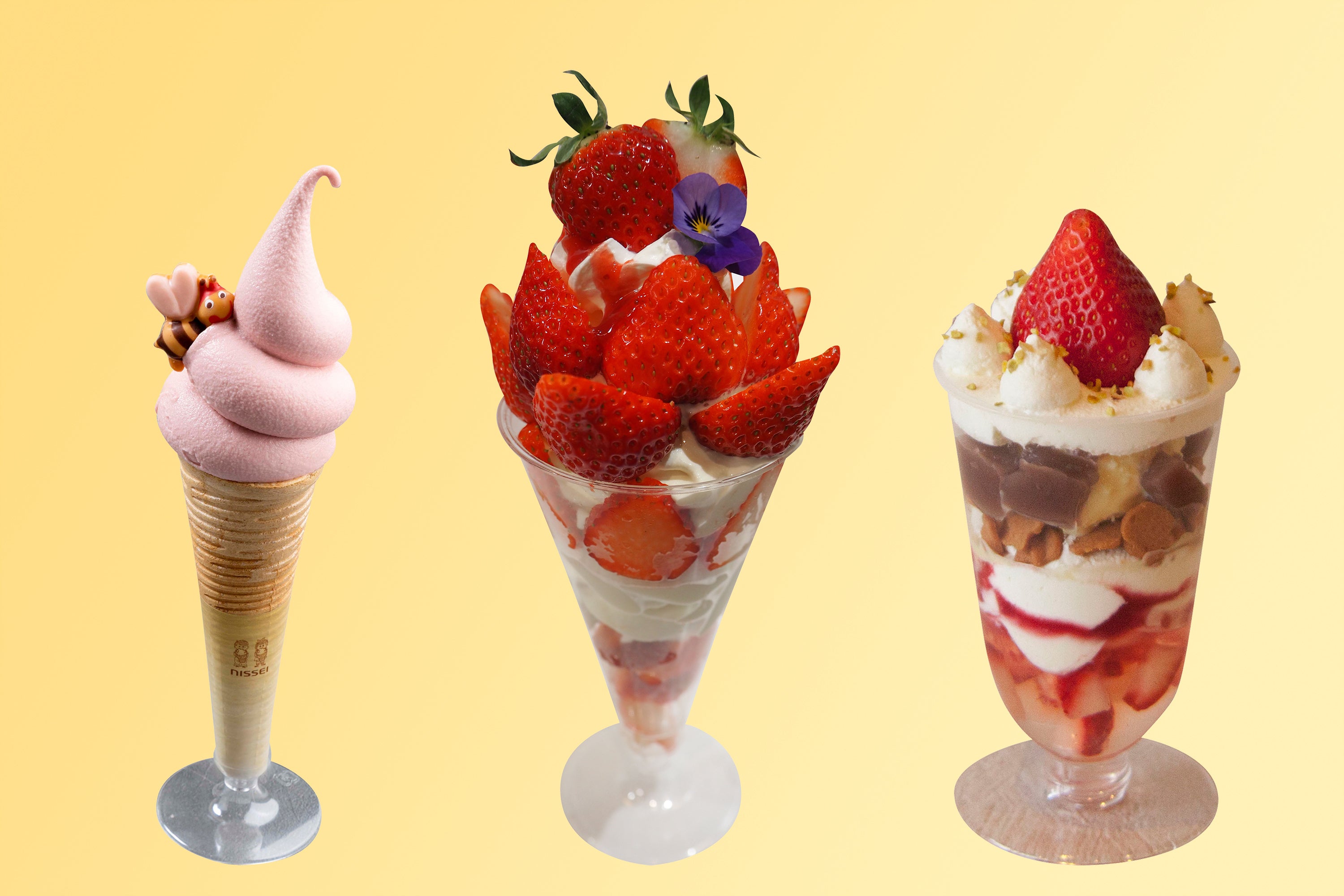 (写真左から)〈フルーツのウメダ〉プレミアムあまおうソフトクリーム(1個)500円