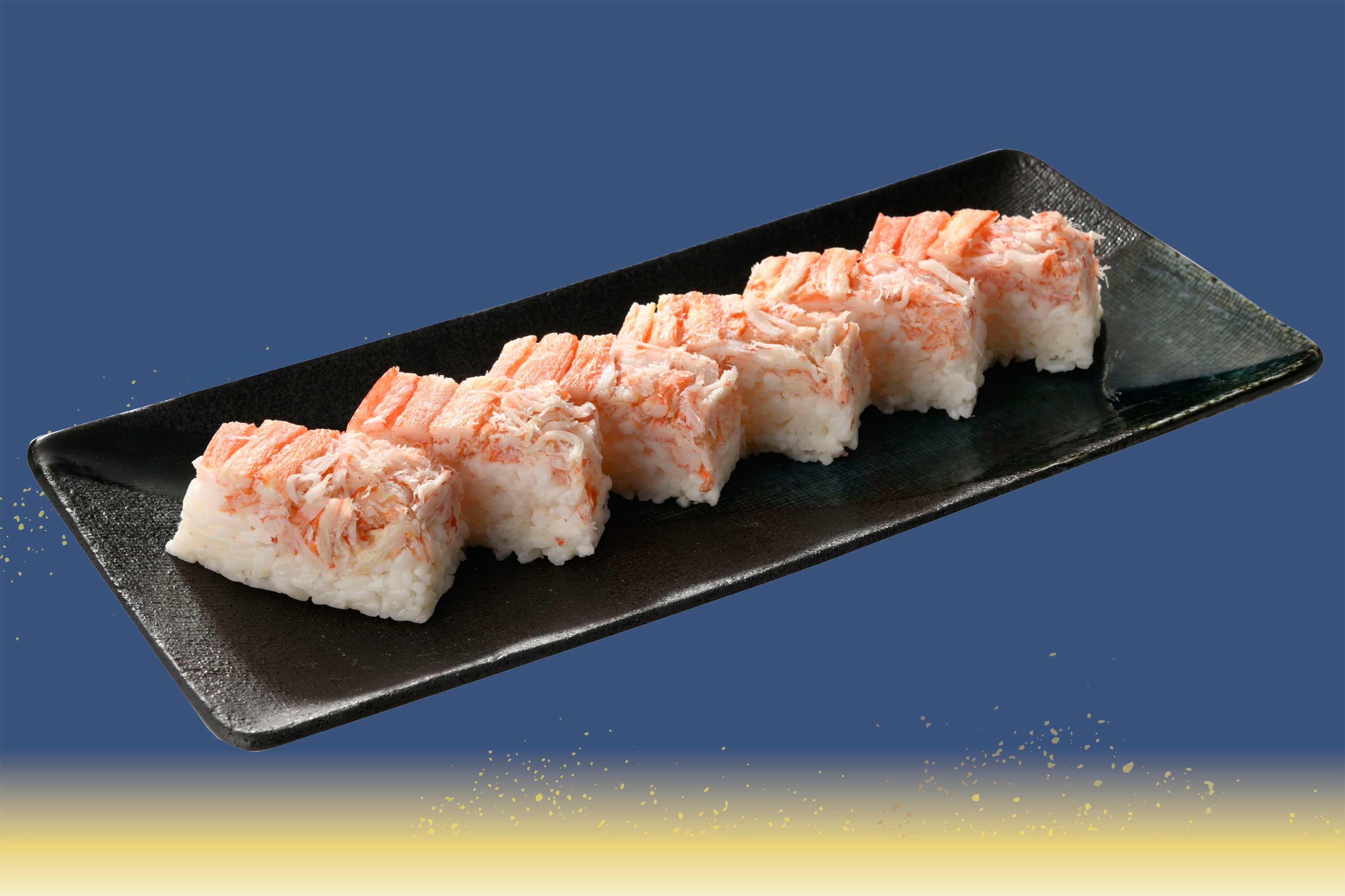 国産の紅ズワイ蟹の足の身とほぐし身を使用し、自家製の蟹酢で漬け込んだ押し寿司。
