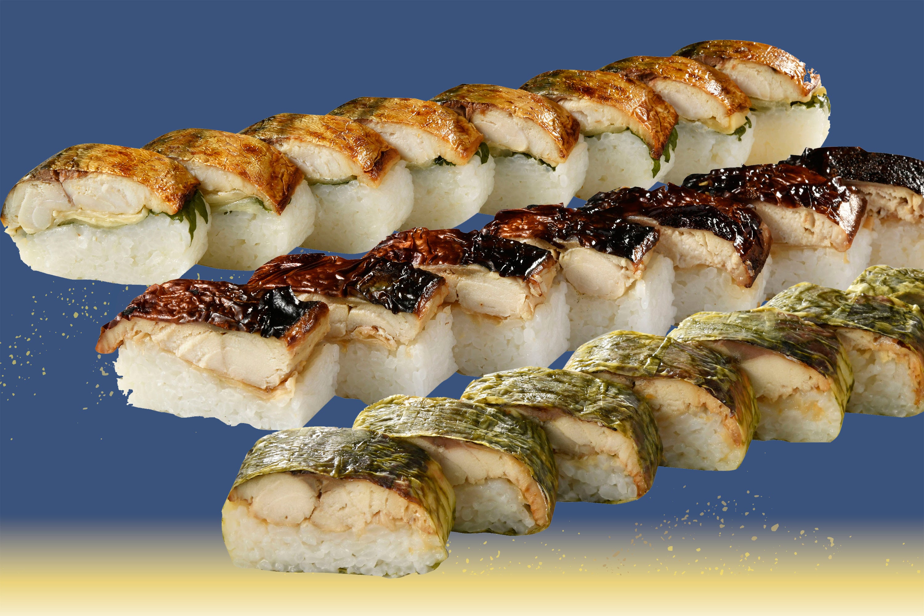 (上から)〈若廣〉焼き鯖すし(8貫)1,296円