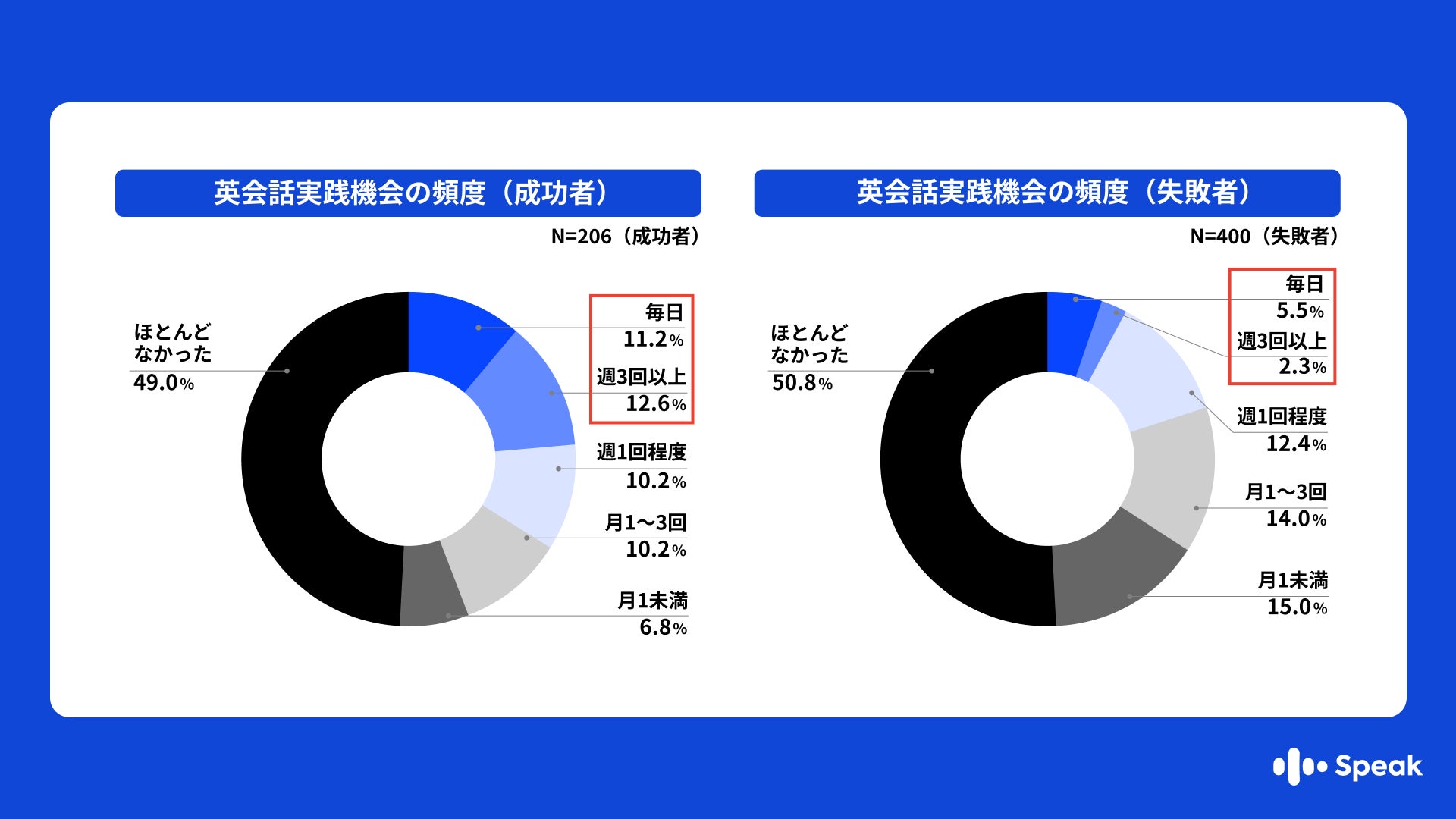 ①【頻度の格差】英会話学習の成功者は、失敗者に比べて「週3回以上英語を話す」割合が約3倍高いことが判明!