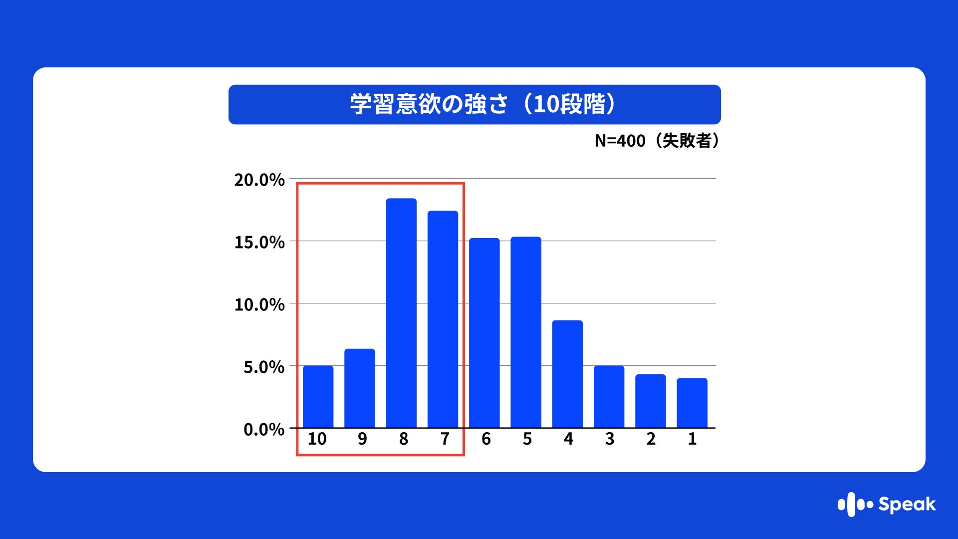 ・失敗者の学習開始時の意欲(モチベーション)は10点満点中「7〜10点」の高得点者が多く、やる気不足が原因ではないことが伺えます。