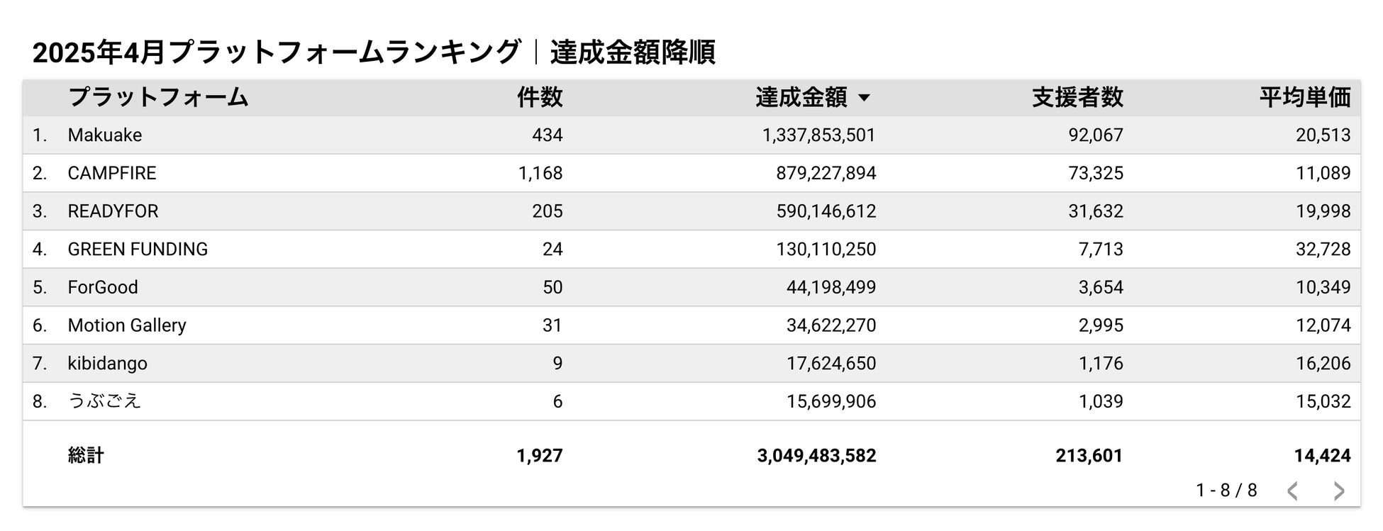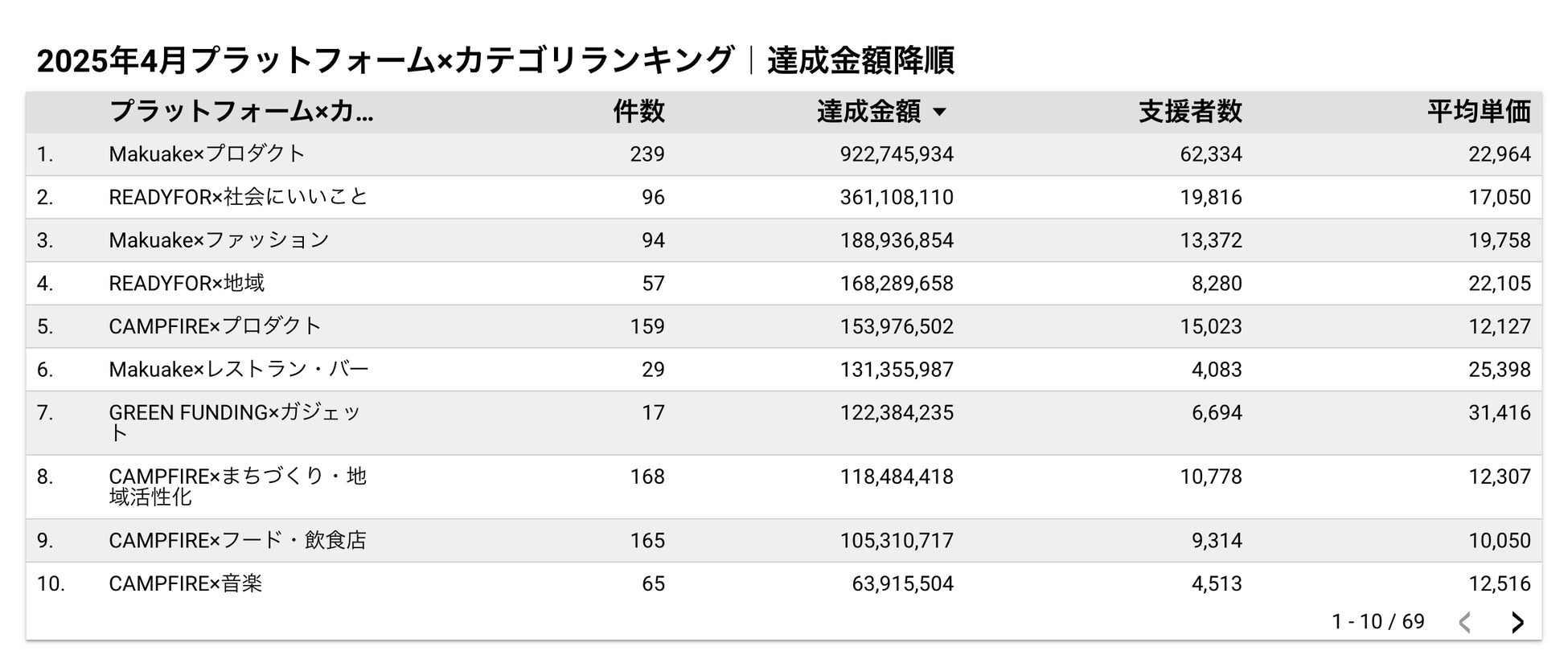 2025年4月に実施されたクラウドファンディングの達成金額ランキングTOP5では、支援額・支援者数・平均単価・達成率の各データが以下のように発表されました。