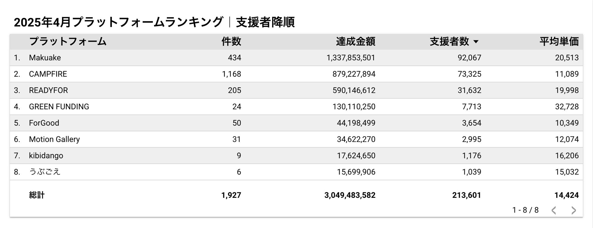 【プラットフォームランキング】プロジェクト件数は「CAMPFIRE」、支援額・支援者数ともに「Makuake」が圧倒的首位!