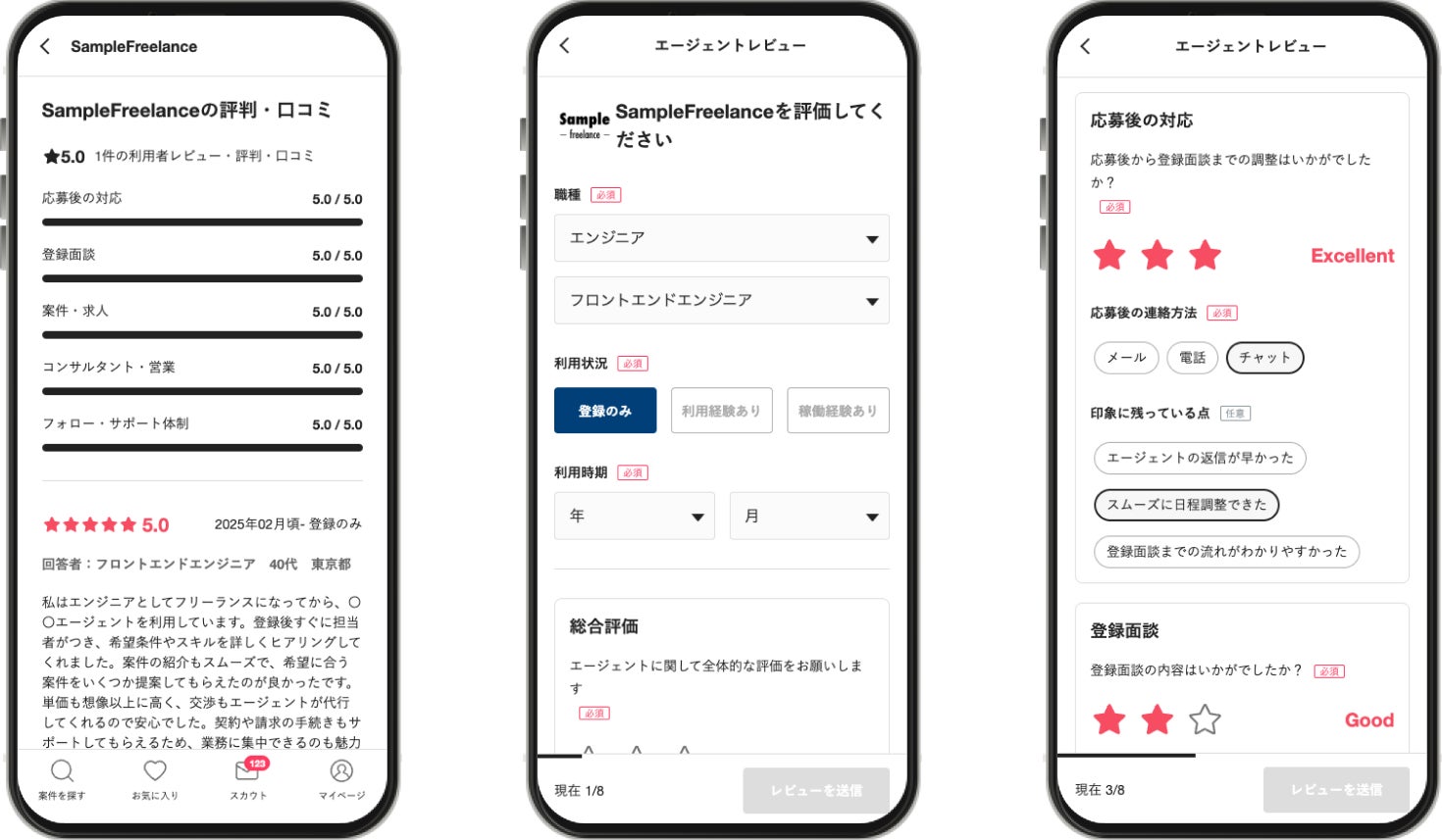 フリーランスエージェントを利用されたフリーランスの皆様によって、下記5項目が5段階評価で表示されます。また、公開レビューを通じて他フリーランスの方の感想を閲覧できます。