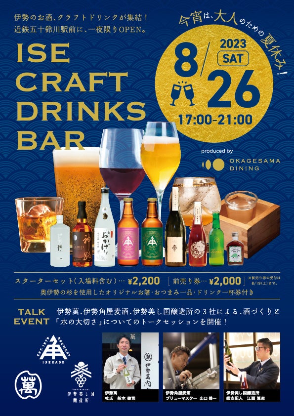 さらに、三重県伊勢市でお酒を作っている「伊勢萬」「伊勢角屋麦酒」「伊勢美し国醸造所」の3社による、酒づくりと「水の大切さ」 についてのトークセッションを開催。普段皆さんが何気なく召し上がっているお酒に込められた想いや、伊勢という土地での酒づくりの特徴など、普段は聞けないここだけのトークを美味しいお酒とともにお楽しみください。