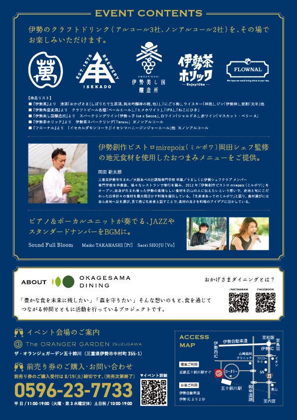 日時:2023年8月26日(土)17時〜21時/場所:ザ・オランジェガーデン五十鈴川(三重県伊勢市中村町355-1 )