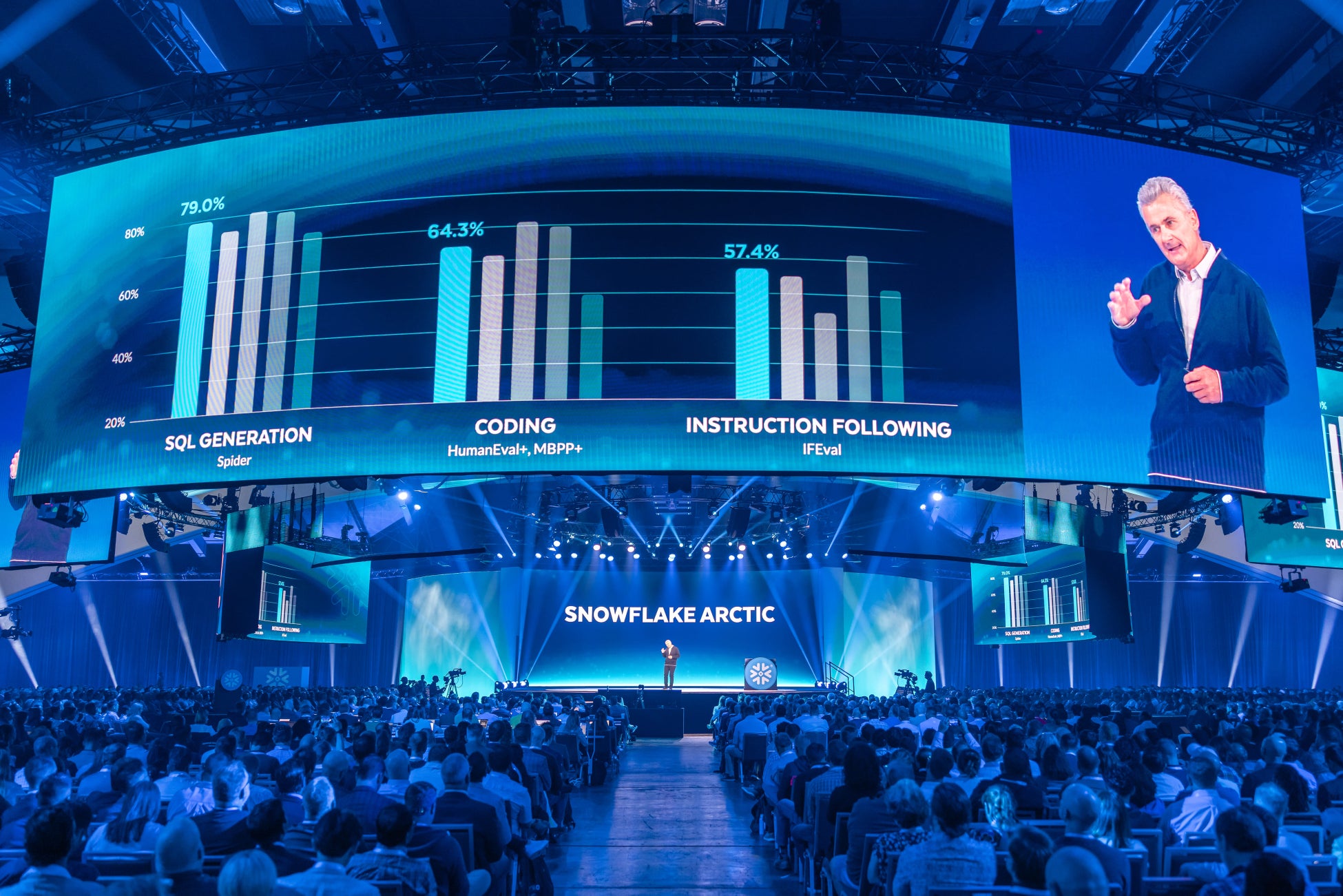 プロダクト担当EVPのChristianは、「SnowflakeがAIデータクラウドで目指しているのは、より速く、より良く、そしてもちろん人工知能のトレンドを活用して、お客様がデータからより多くの価値を引き出し、企業の目標を達成するお手伝いをすることだ」と語り、「データ基盤の強化」「アプリケーション」「AI」の3つを軸に新機能について紹介しました。エンジニアリングチームと製品チームによるライブデモやパートナー企業との対談も行われ、Snowflakeを利用したAIソリューションやビジネス課題の解決について語られました。