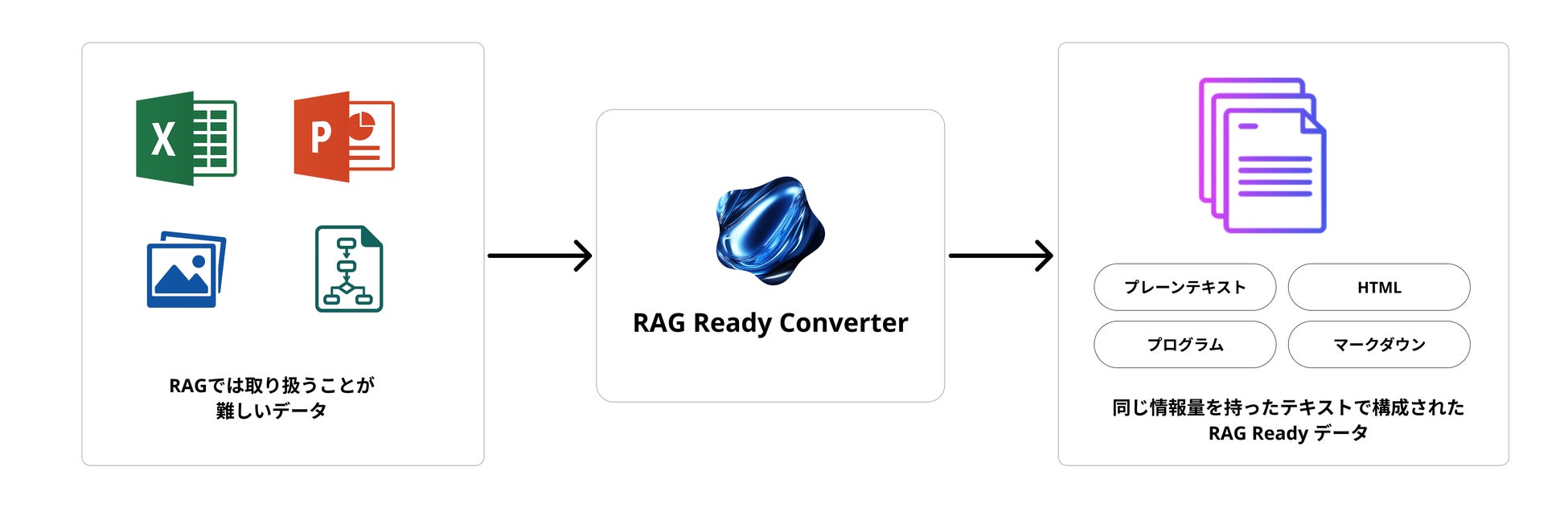 RAG Ready Converter は、ExcelやPowerPointなどのデータに含まれる 画像 / 表 / フローチャートなど、テキストではないデータを RAG Ready なテキストに変換(Deplot)することで、RAGので精度を向上するツールです。