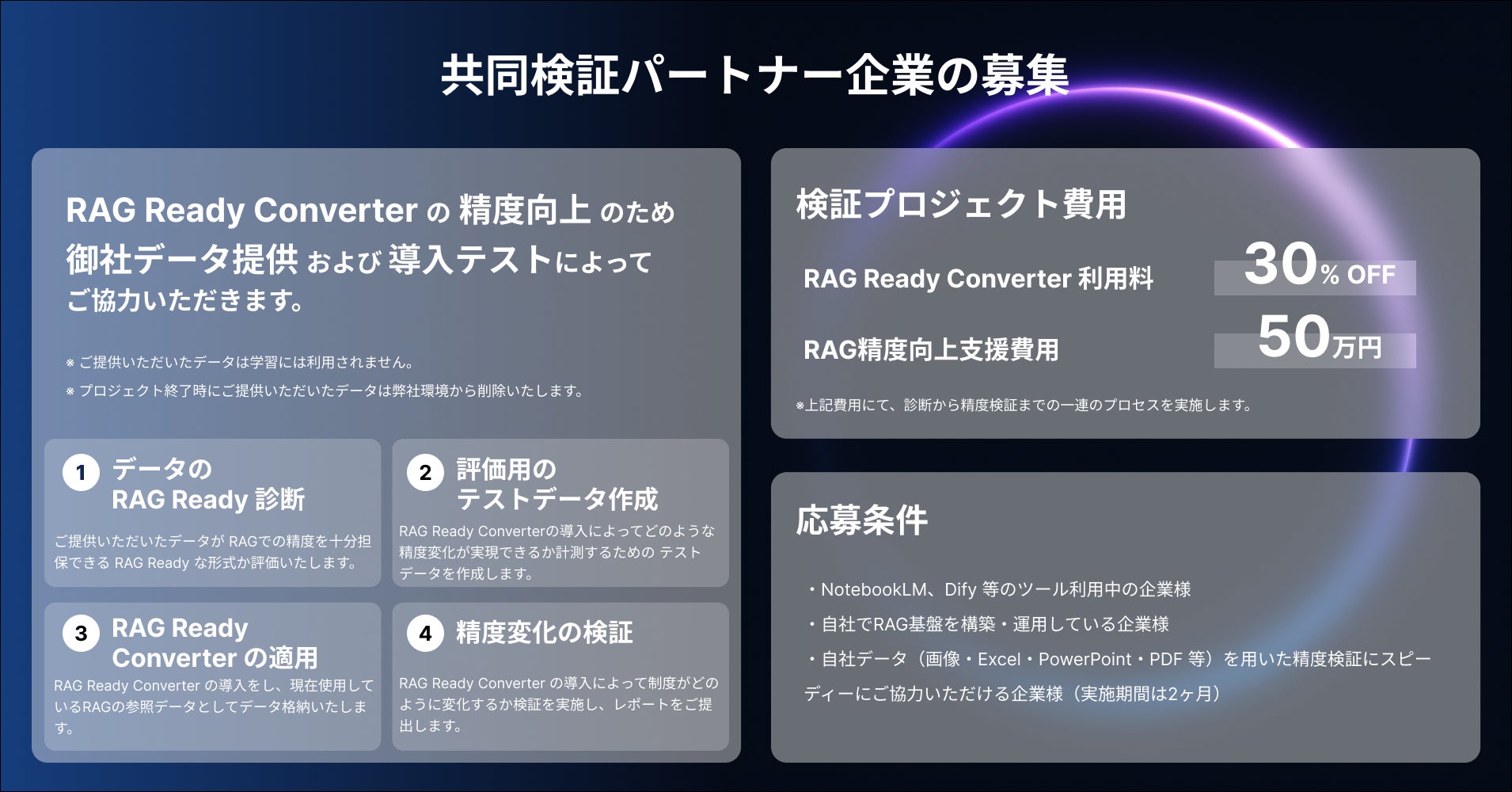 本プログラムは、「RAG Ready Converter」を用いて、企業が保有する実データを元に、RAGの精度を実証的に検証・改善する共同検証プロジェクトです。