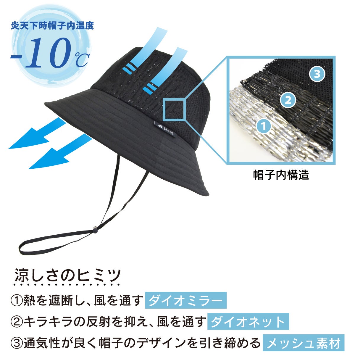 [ShaBō遮帽ウルトラライトバケットハット] 猛暑に効果を発揮するアルミクールテックを搭載。重さわずか約75gの軽くて涼しい帽子、地球沸騰化時代の解決策に
