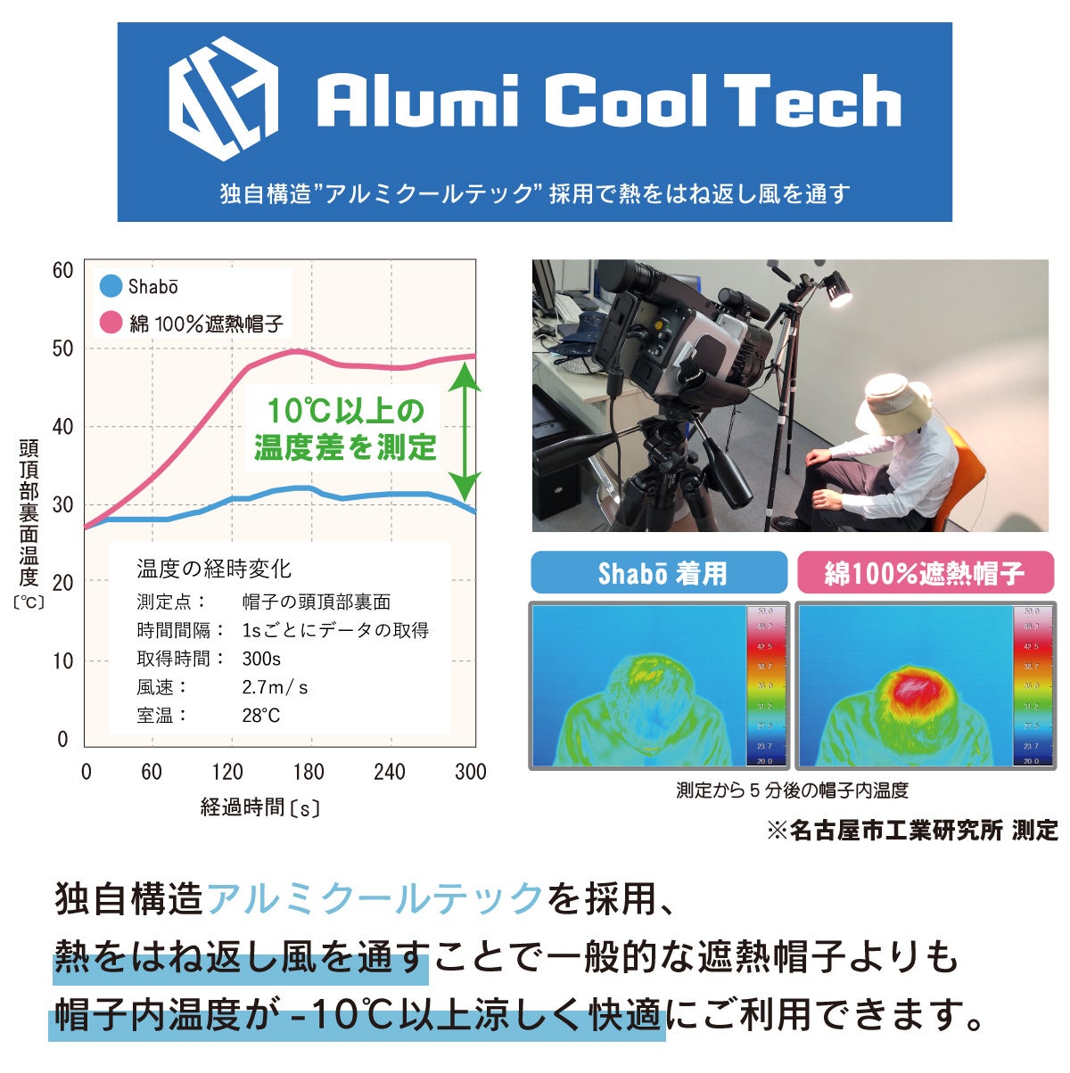 名古屋市工業研究所にて、涼しさの試験を実施したところ、他の遮熱帽子と比較して10℃以上涼しいという結果を取得しました。