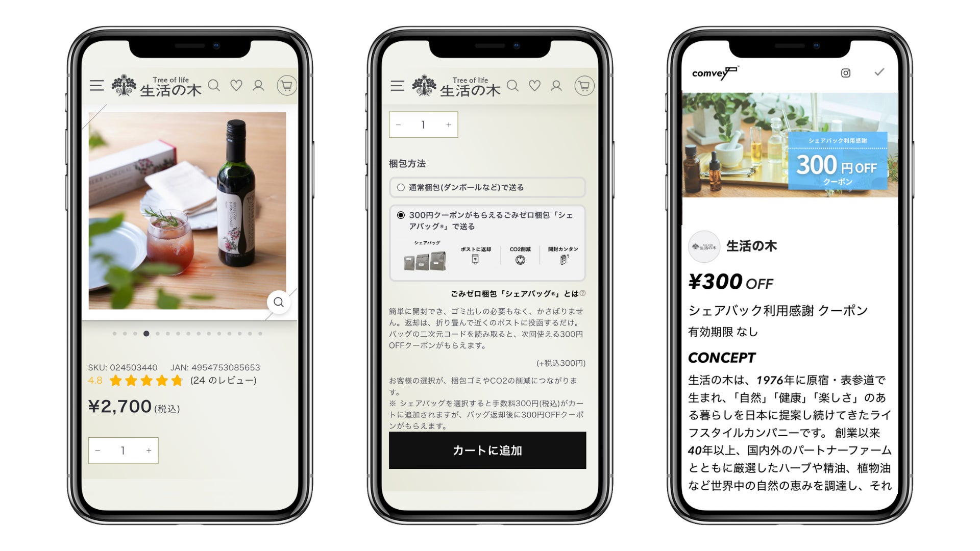 株式会社comvey(コンベイ、本社:東京都中央区、代表取締役:梶田伸吾)は、株式会社生活の木(本社:東京都渋谷区、代表取締役:重永 忠)が展開する「生活の木」公式オンラインストアに、郵便ポストに返却できるリユース梱包「シェアバッグ®︎」およびオペレーションシステムが導入されたことをお知らせ致します。本サービスの導入により、利用者の梱包ストレスを解消できるほか、配送で発生する梱包ごみを最小限に抑え、ダンボール回収やごみ焼却時に発生するCO2排出量を85%以上削減、脱炭素化を推進することが可能となります。