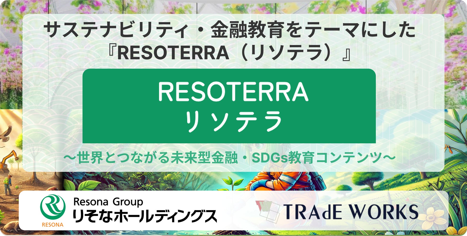 金融システム開発サービスやECプラットフォームなどのシステム開発を展開する株式会社トレードワークス(以下「当社」、本社:東京都港区、代表取締役社長:齋藤 正勝)は、株式会社りそなホールディングス(取締役兼代表執行役社長兼グループCEO:南 昌宏、以下「りそなHD」)と共同で、サステナビリティ・金融教育をテーマにした『RESOTERRA(リソテラ)』を企画・開発いたしました。本プロジェクトは、2025年に開催される2025年日本国際博覧会(以下「大阪・関西万博」)において、「バーチャル万博~空飛ぶ夢洲~」に出展いたします。