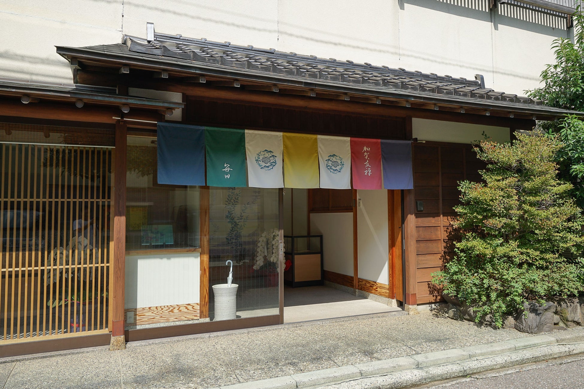 加賀友禅作家の毎田健治、仁嗣による着物・内装・小物等の制作を行う染色工房です。代表の毎田健治は日本工芸会正会員でもあります。数少ない全工程一貫生産の友禅工房で、繊細な草花模様をベースとした独自の着物デザインを築いています。毎田染画工芸は、伝統工芸を「古いもの」ではなく「現在へ続くファッションの積み重ね」と考え、三代にわたって守り続けてきた伝統の技を用いながら、加賀友禅のエッセンスを洋装、商品パッケージ、建築装飾など、きもの以外のさまざまな創作物に落とし込む挑戦を続けています。