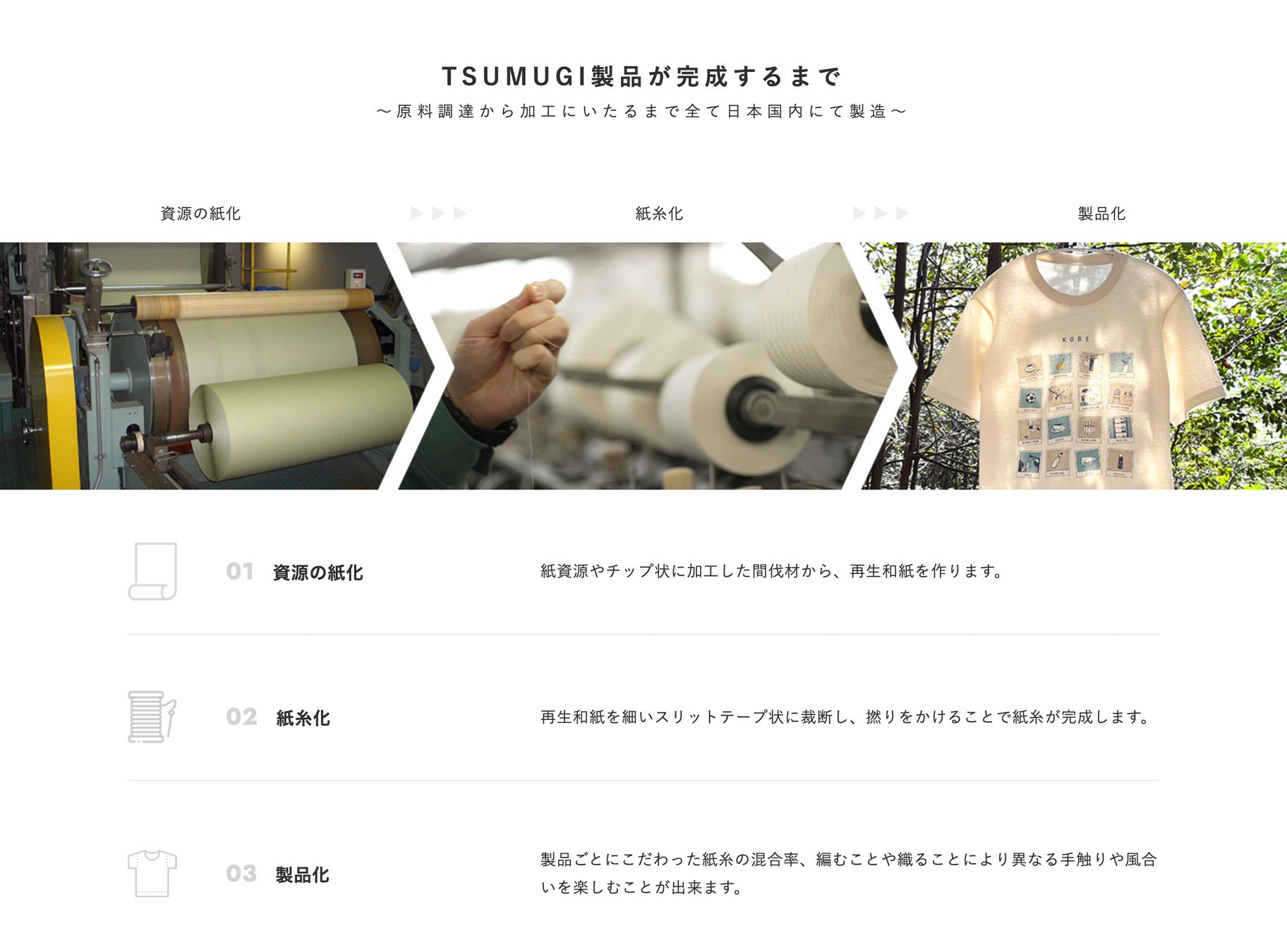 プロジェクト「TSUMUGI」は、使用後の紙資源や未利用の間伐材を紙糸に生まれ変わらせる取り組みです。紙糸は、天然繊維ならではの柔らかさと、軽量性、吸放湿性が特徴で、まるで自然の中にいるようなやさしい肌触りを感じることができます。しっかりとした縫製で、みなさまに長く愛用してもらえるようMade in Japanならではの技術が詰まっています。「TSUMUGI」という名前には、わたしたちと地球や社会・地域コミュニティを紡ぐ象徴として手に取っていただきたいという想いが込められています。