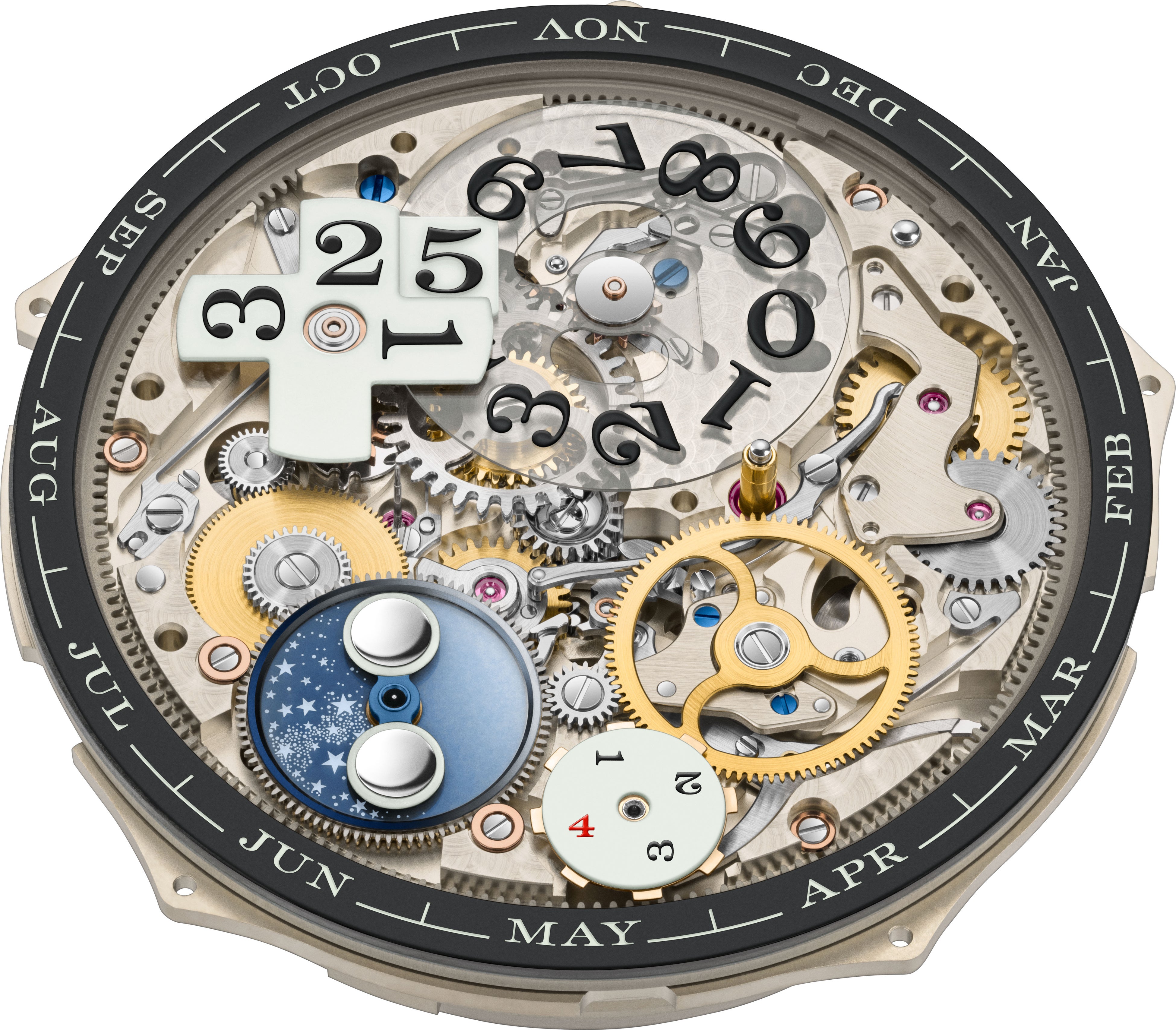 中でも発光するアウトサイズデイト表示は、十の位用の十字プレートと一の位用のディスクで構成される精巧なメカニズムを暗闇でも視認可能にしています。さらに、デイ・ナイト表示を組み込んだ発光するムーンフェイズ表示は、この時計で初めて搭載となります。月の軌道の背景となるのが、24時間で時計回りに一回転する天空ディスクです。日中は星のない明るい空が、夜には発光する無数の星がちりばめられた夜空が広がります。天体ディスクの前面では、地球の伴星である月がゆっくりと空を横切りながら正確に満ち欠けを繰り返す様子を観察することができます。このムーンフェイズ表示に1日分の誤差が生じるのは122.6年後です。