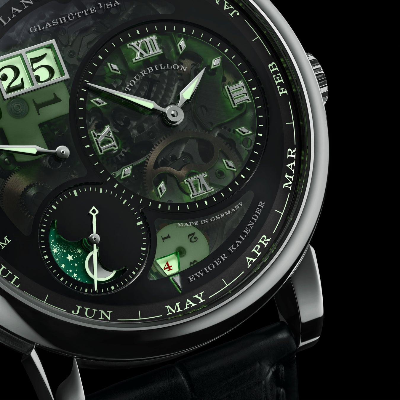 ランゲ1・トゥールビヨン・パーペチュアルカレンダー“ルーメン”のすべての表示には蓄光処理が施されているため、暗闇の中でも一目で正確に表示を読み取ることができます。大胆なまでの発光面と、どこまでも繊細なフィリグリー模様の装飾を施した面とが絶妙な調和を奏でることによって、エレガントでニュアンス感のある光の表情が生まれています。それぞれの“ルーメン”表示を実現するため、革新的で複雑なダイヤル構造が採用されています。