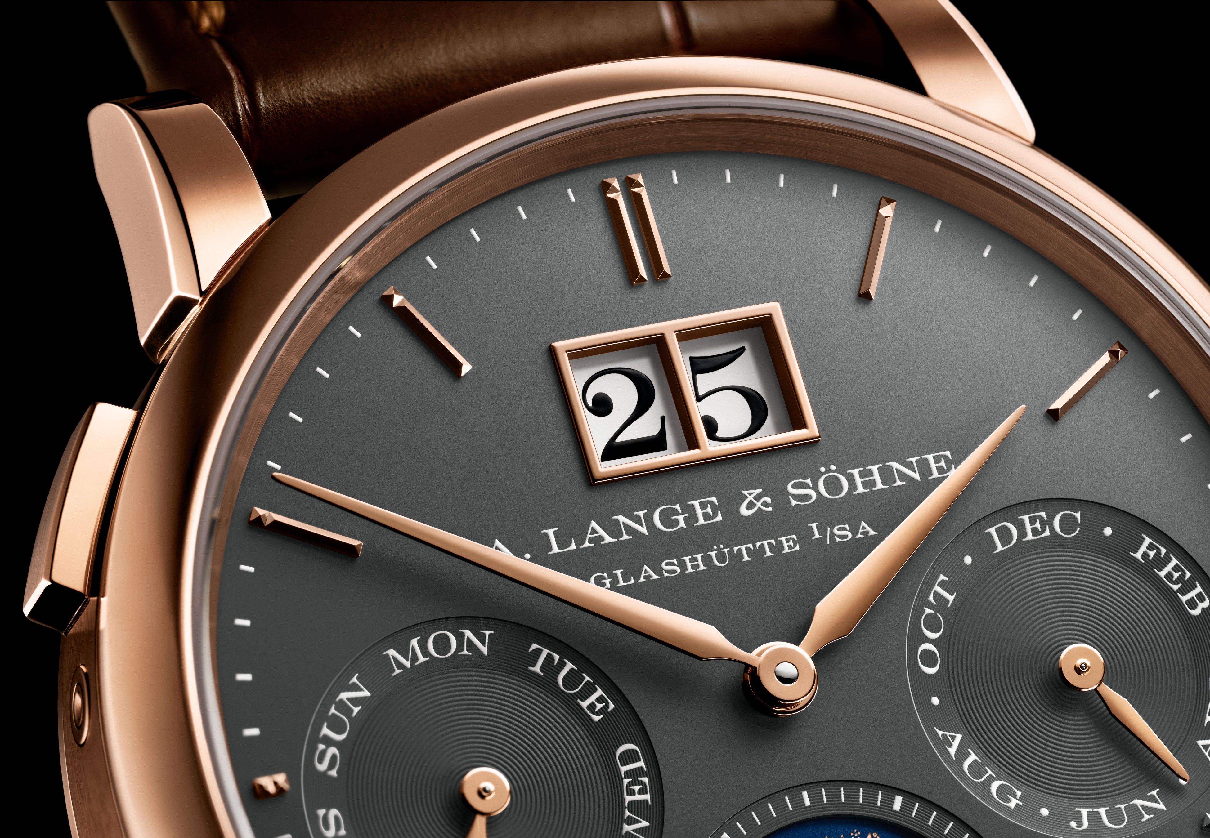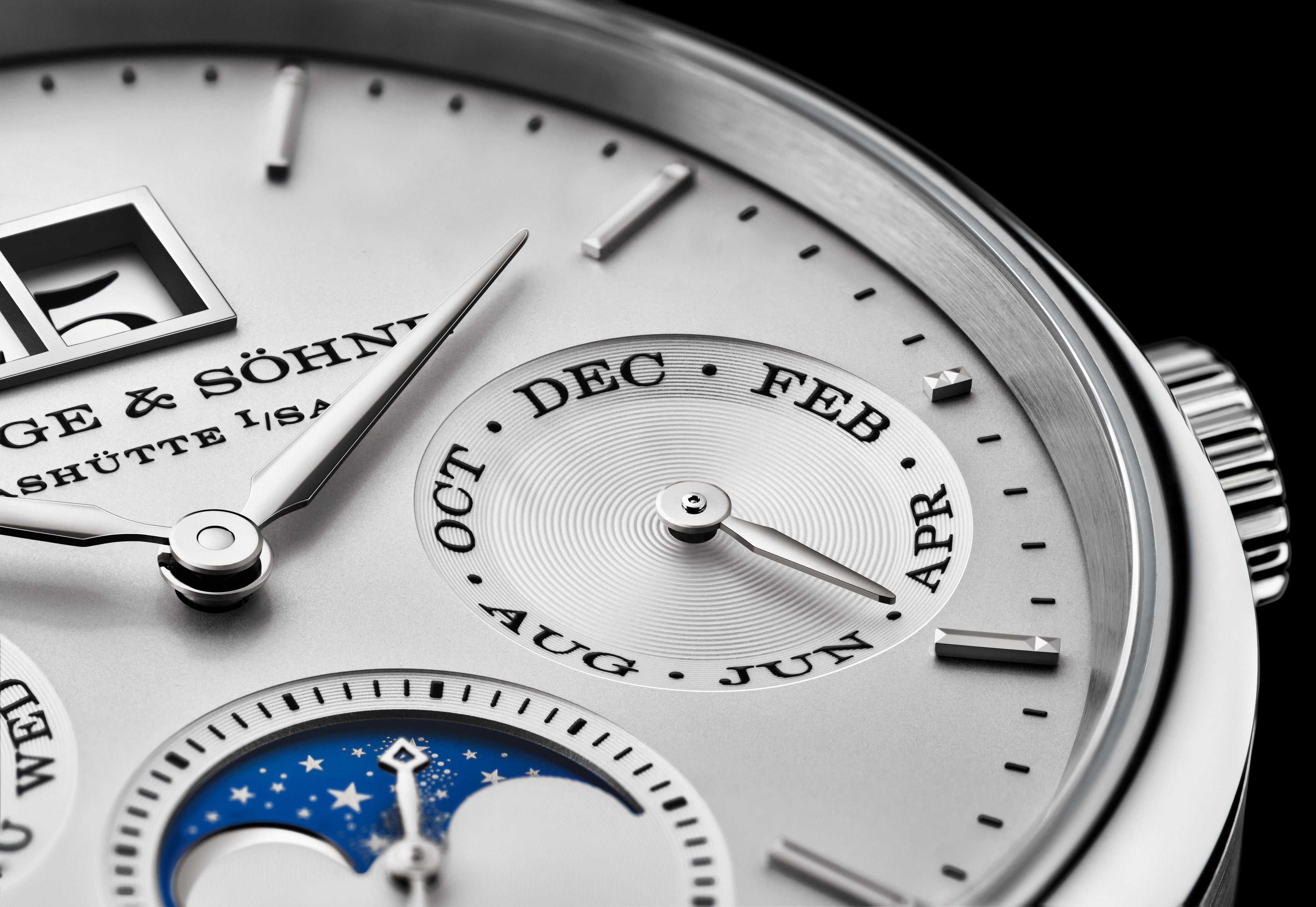 ランゲが考案したこの機構は使い勝手の良さも魅力で、すべてのカレンダー表示とムーンフェイズ表示は、それぞれのプッシュボタンで個別に調整できるだけでなく、10時位置のプッシュボタンを使えば、一括で表示を進めることも可能となっています。