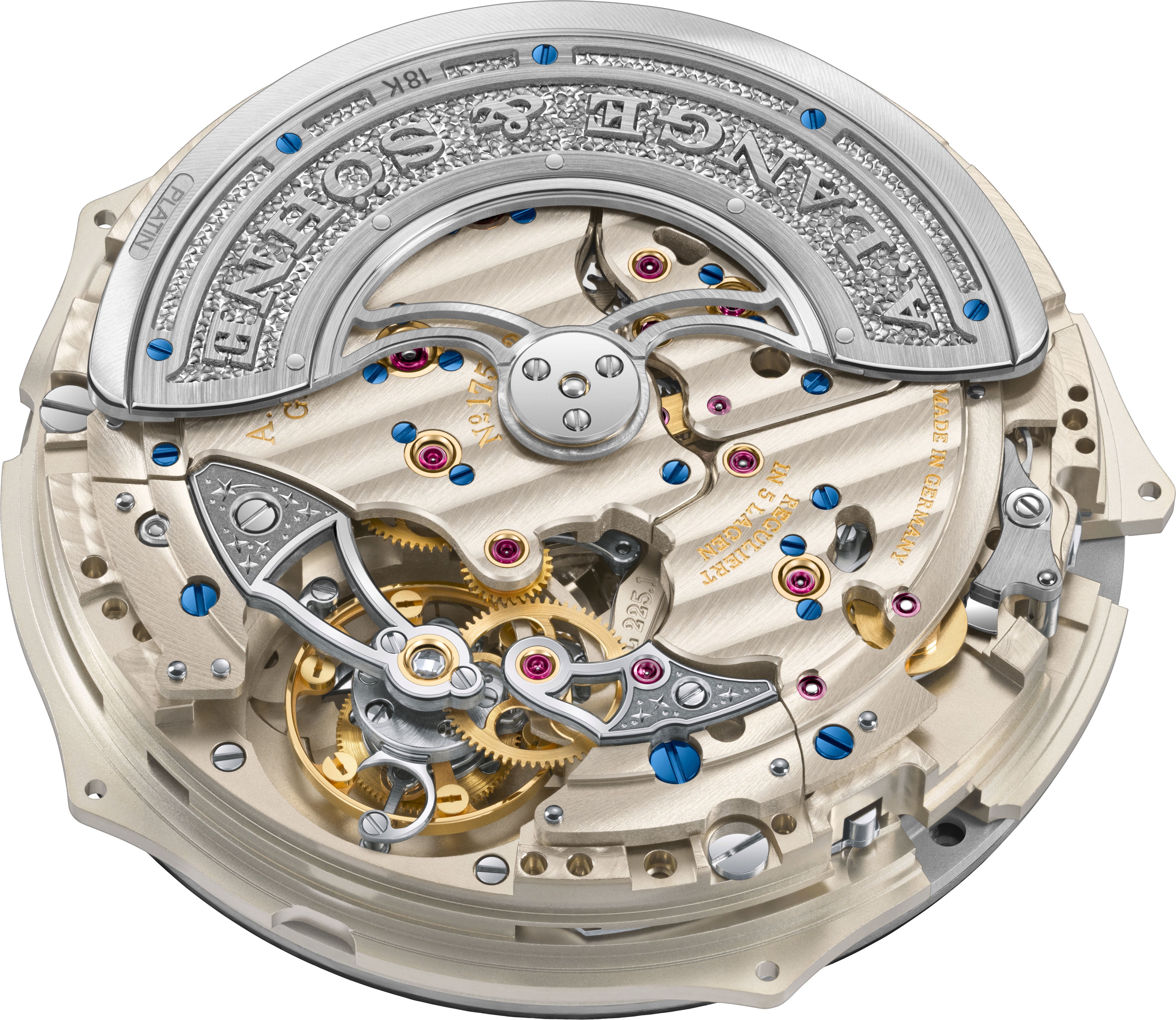ランゲの哲学に従い、二度組みされるムーブメントのすべての部品には、贅沢な仕上げが施されています。控えめなダイヤルデザインとは対照的に、サファイアクリスタルのケースバック越しに見えるのは、19世紀のザクセン王室宮廷に端を発する、ザクセンの精密時計製作の華麗な美しさです。だからこそ、ハンドエングレービング入りテンプ受け、繊細な表面研磨やその他の仕上げ技法、さらにビス留め式ゴールドシャトンといった伝統的な要素が、この時計ファミリーの名の由来でもある歴史的なつながり 「サクソニア(ザクセン)」を象徴しているのです。