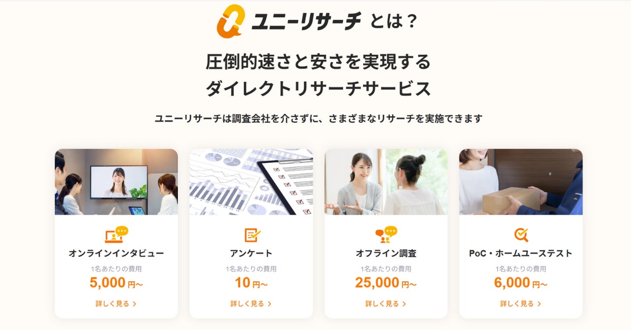 ユニーリサーチは、「最短当日・従来の調査費用の10分の1以下」で顧客の声を聞くことが可能な、ユーザーインタビュープラットフォームとしてサービスを開始しました。