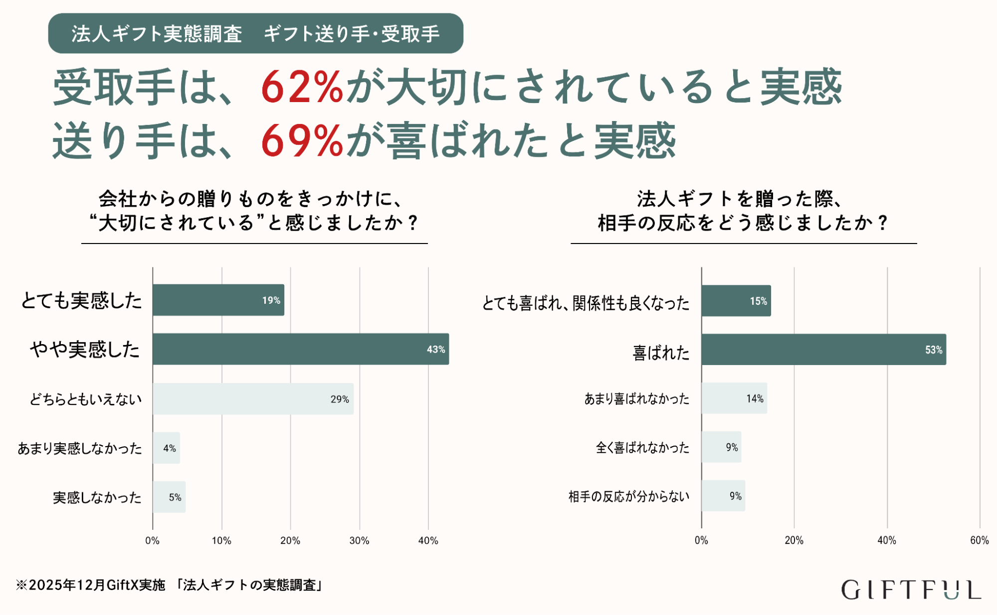 送り手の69%が「喜ばれた手応え」を感じ、受取手の62%が「大切にされている」と実感しています。