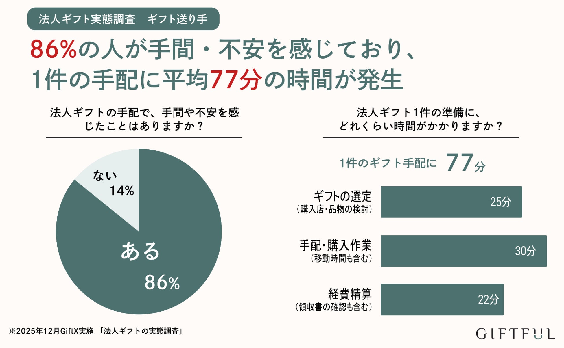 法人ギフトの手配では、86%が手間や不安を感じ、1件あたり平均77分の工数がかかっています。