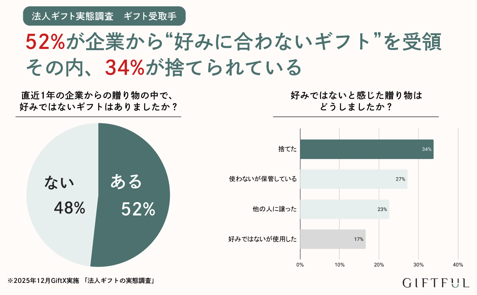 直近1年で企業から贈られたギフトのうち、52%が「好みに合わなかった」と回答。また、好みに合わなかったギフトの約3分の1が廃棄されているのが実態です。