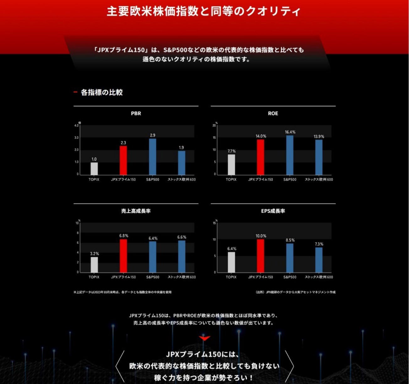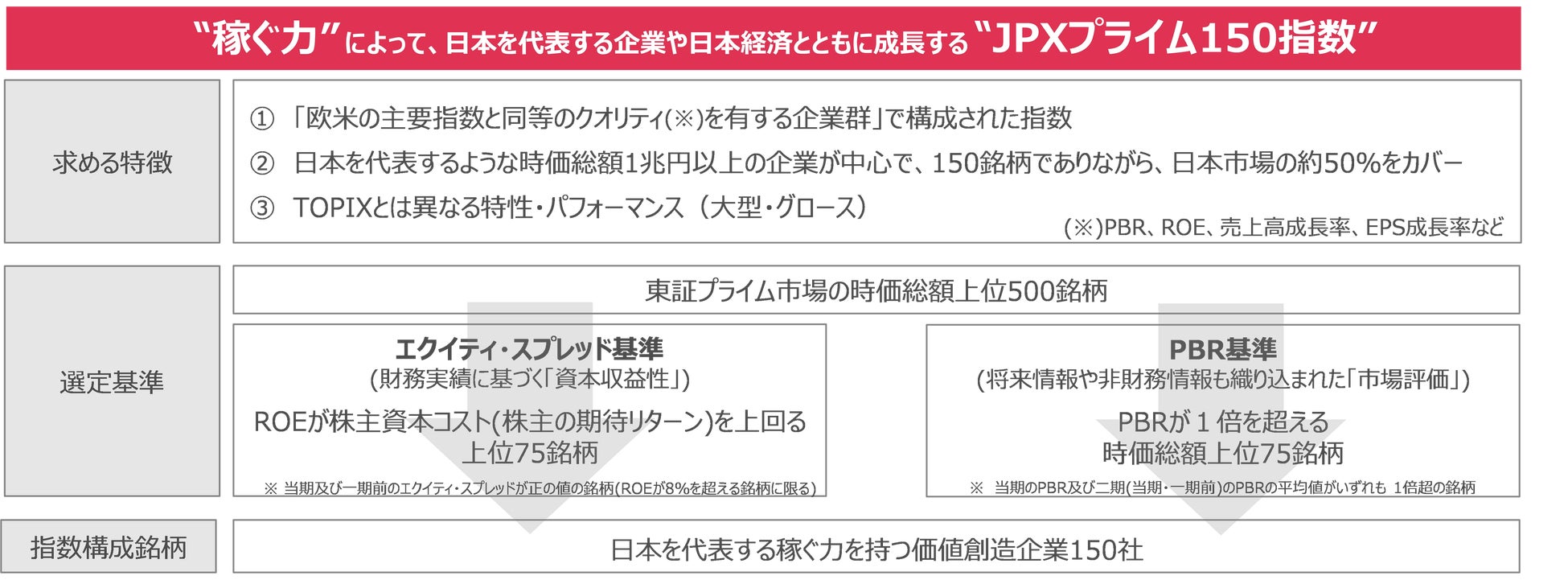 対象銘柄の選定にあたっては、プライム市場に上場する時価総額上位銘柄より、(1)ROE(株主資本利益率)と株主資本コストの差である「エクイティスプレッド」、(2)株価による市場評価である「PBR」、という価値創造を測る二つの指標を用いており、「経営の効率性が高く、市場からも評価されている日本を代表する優良企業群」150社で構成された、主要欧米株指数と比べても遜色のないクオリティの株価指数となっています。