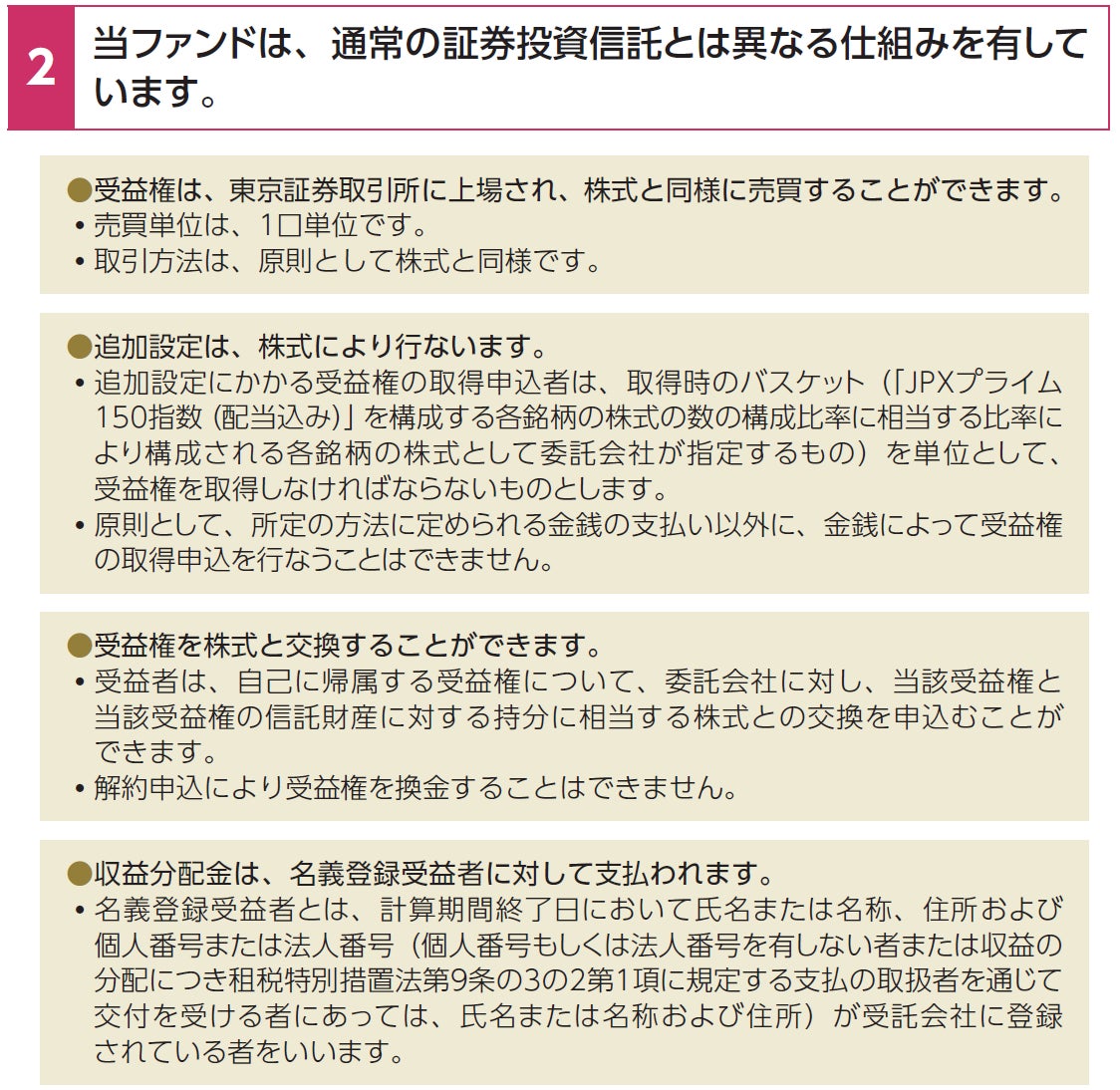 当社では、上述のコンセプトを持つ「JPXプライム150指数」に連動する商品を通じ、「投資家が“稼ぐ力”を持つ企業に投資を行なうことで、日本に価値創造経営が浸透し、その果実が投資家に分配され、さらに投資が行なわれる」といった好循環を生み出す機能の一翼を担いたいと考え、当ETFを組成いたします。