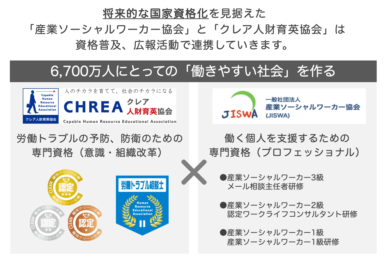労働人口6,700万人にとっての働きやすい環境を作るため、事業提携します。今後は両団体の理事、講師、有識者と共同した広報活動による相互発信を始め、資格受講時の割引特典などを検討していきます。