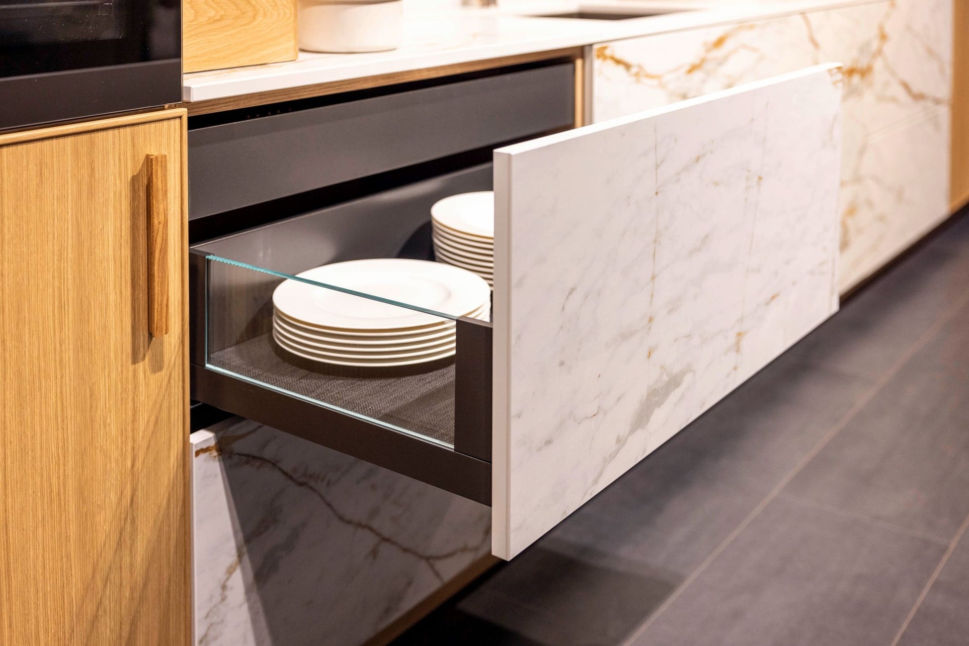 nobiliaの新しいnBOX引き出しシステムは、わずか10.7mmという極めてスリムな側板プロファイルを特徴としています。このミニマルなデザインは、キッチン全体にエレガントで軽やかな印象を与えるだけでなく、引き出し内の収納スペースを最大化する実用性も兼ね備えています。