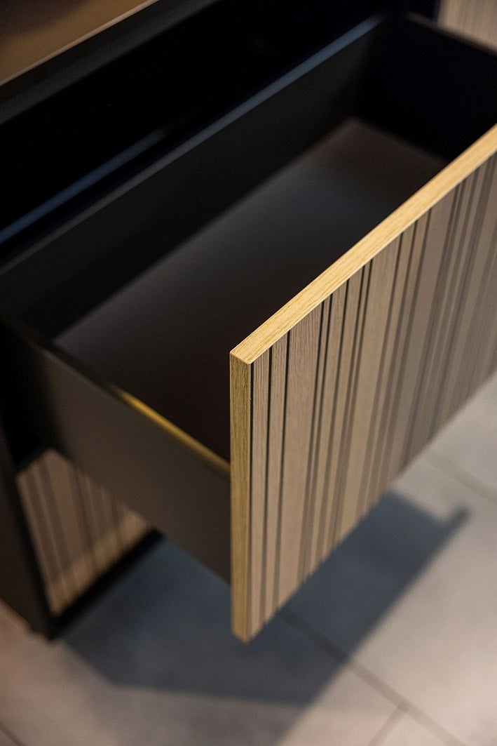 繊細なデザインは、キッチンアイランドやトール収納、シェルフといった要素に丸みを帯びた輪郭を加え、テクスチャ加工された表面と組み合わせることで、新しい魅力を生み出します。