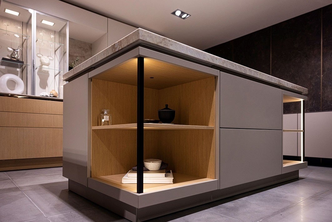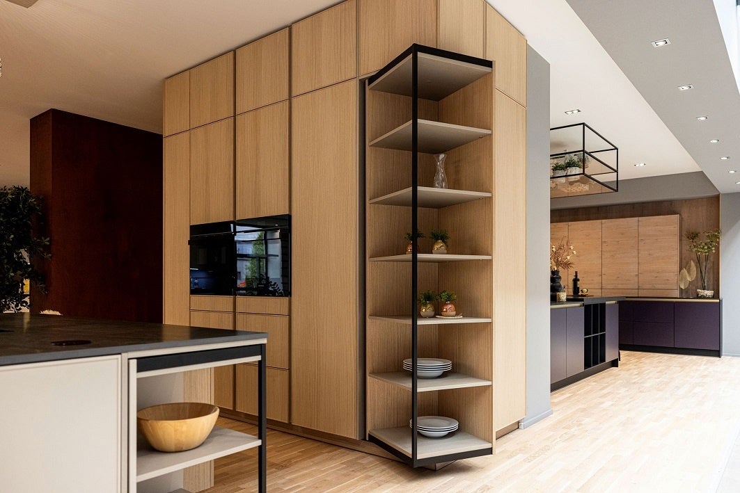 今年のキッチンマイルでは、Beeck Küchen(ベークキッチン)やSieMatic(ジーマテック)といった著名なメーカーが披露した旋回式の背の高い収納家具やアイランド型キッチンコーナーキャビネットに、多くの来場者が驚嘆しました。これらの革新的なソリューションの鍵を握るのは、ヘティヒの画期的な旋回式金具システム「FurnSpin(ファーンスピン)」です。