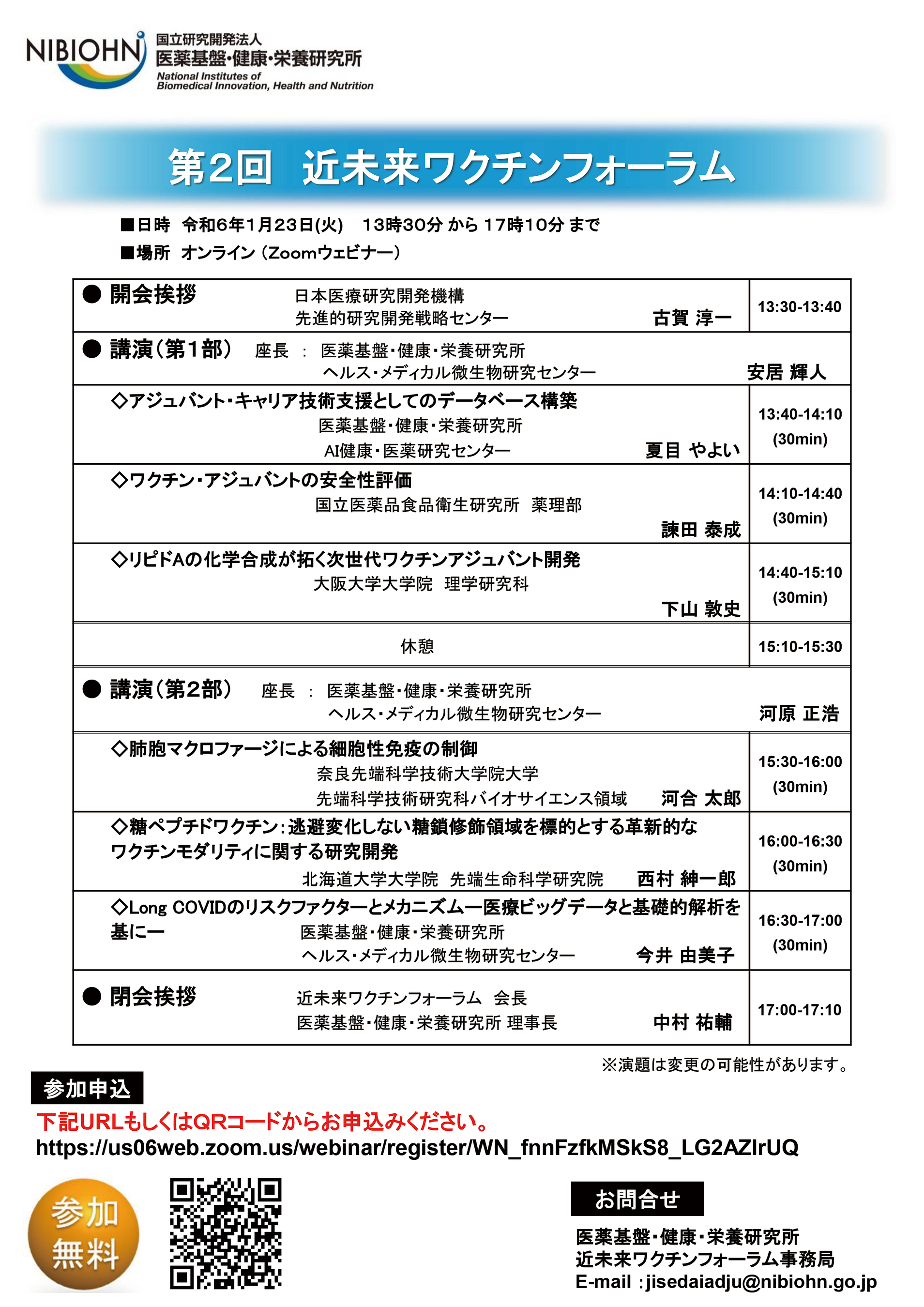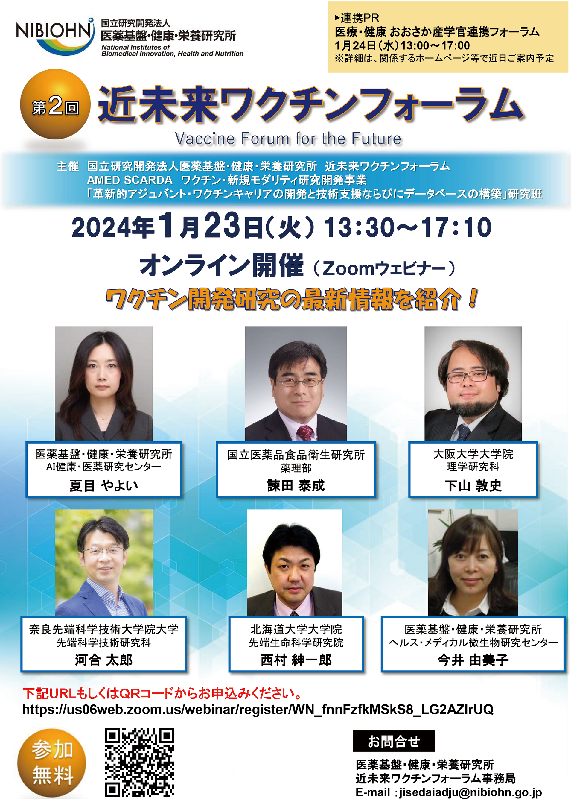 昨年度の開催に引き続き、この機会を利用し、「ワクチン・新規モダリティ研究開発事業」の研究開発課題「革新的アジュバント・ワクチンキャリアの開発と技術支援ならびにデータベースの構築」(國澤班)のアウトリーチ活動として活動内容を広く周知いただきます。