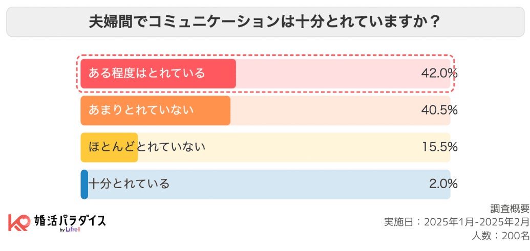株式会社LIFRELL(本社:東京都渋谷区、代表取締役:佐藤 祐介)は、婚活・恋愛に役立つ最新情報をお届けするメディア「婚活パラダイス」において、夫婦仲に関する実態を探るべくアンケート調査を実施いたしました。