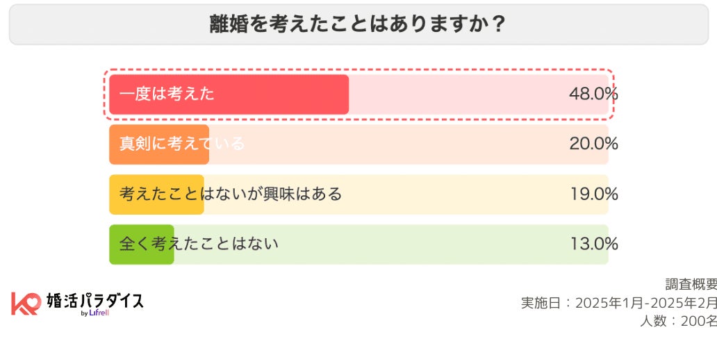 「一度は考えた」が96名と半数近くにのぼり、さらに「真剣に考えている」も40名と、合計すると約68%が離婚を具体的に思案した経験がある結果になりました。