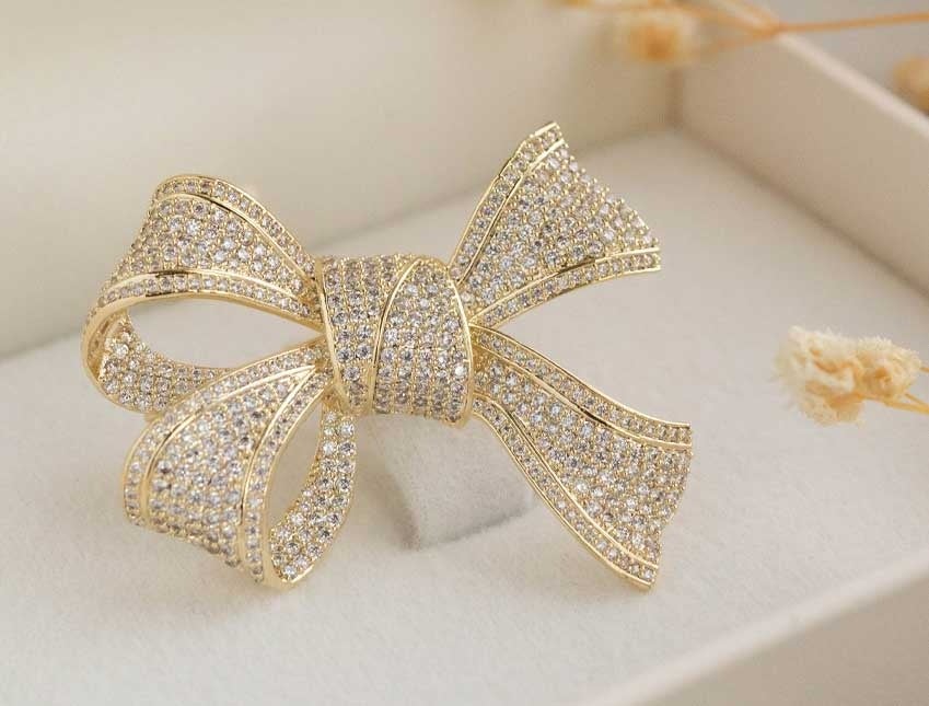 リボンをふんわりと優雅に結わえた形を再現したブローチは、女性らしさを引き立てる、エレガントでキュートなアクセサリー。